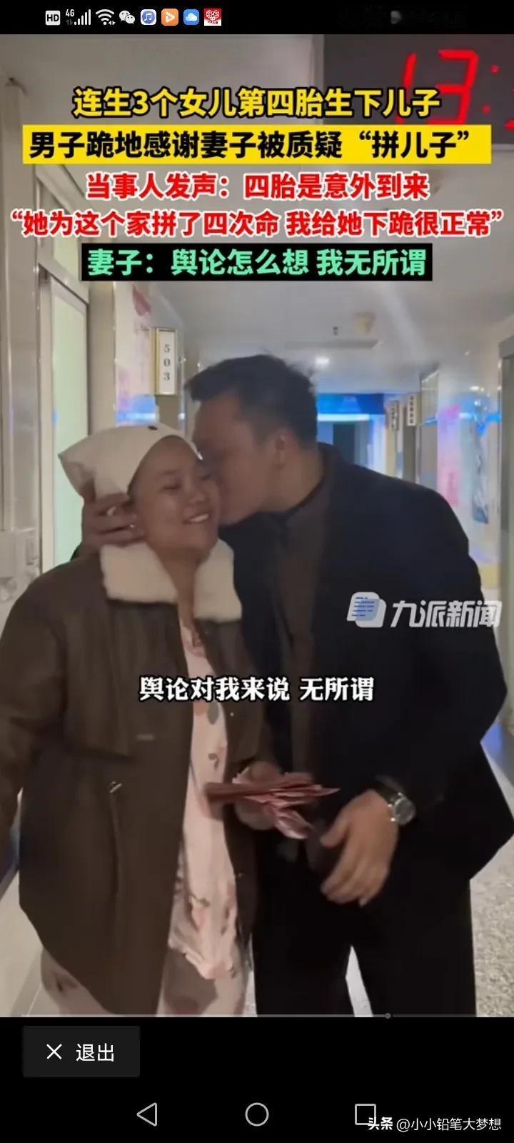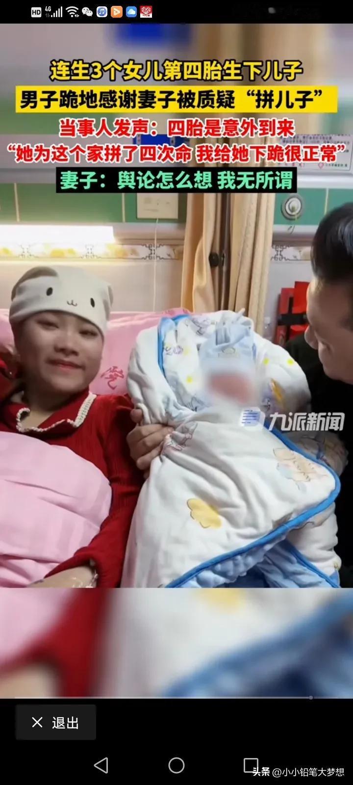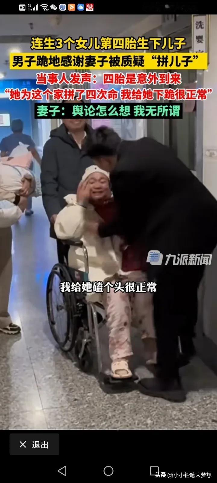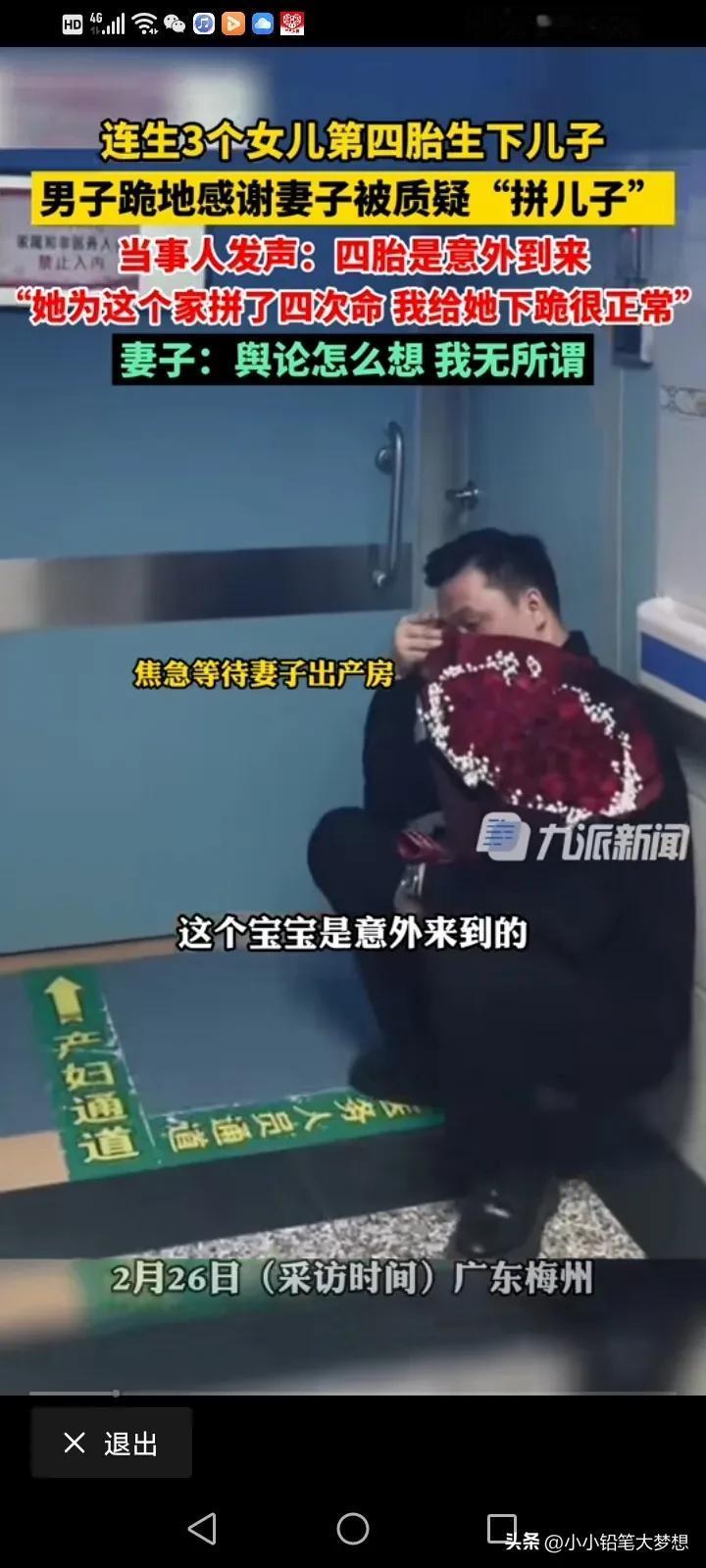 看了真的很心酸,这是有皇位要继承吗?一定要拼儿子吗?广东梅州,一名男对着刚生完产的老婆磕头,后面我看到这位女主手上拿的东西,我突然明白了! 2月26号,广东梅州,一名男子捧着一束红玫瑰,在产房前焦急守候着。 当护士抱着孩子告诉他生了个儿子之后,他十分高兴,随后,护士把他老婆推了出来,他对着刚生产完的老婆磕了一个响头,老婆看着他这个举动,掩面痛哭。 就是这么一个视频,引起了很多网友的关注,网友说,如果这一胎又是生女儿,这个头还会磕吗? 他说,我对我老婆磕一个头很正常,因为他老婆已经跟了自己13年了,前面生了三个女儿,这一胎是意外的到来,没想到生了个儿子,现在凑成了一个好字,他说老婆为自己拼了四次命,所以给他磕了一个头,感谢她的付出。 随后看到他老婆手上拿着一大叠钱,这应该是老公高兴奖励她的,我突然觉得这么有钱也无所谓啦,反正国家已经不限制了随便生,只要生活没有压力,那就多为国家做贡献吧。 #我来唠家常# #记录我的2024#