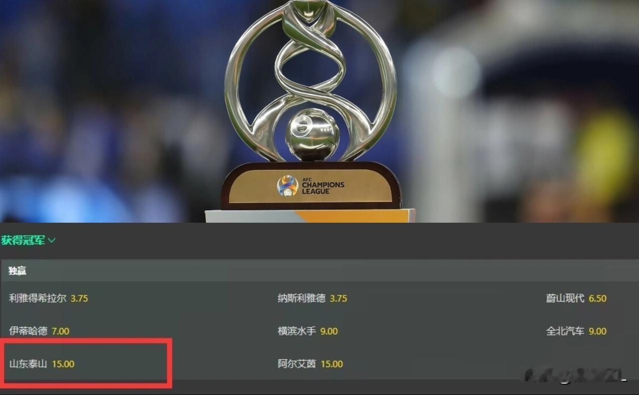 山东泰山队淘汰川崎前锋强势晋级亚冠八强,如此出色的表现却仍不被看好。 亚冠打到八强,权威机构给出了夺冠赔率,东亚区山东泰山队夺冠概率排名垫底,排名最高的是蔚山HD,其次是横滨水手和全北现代。