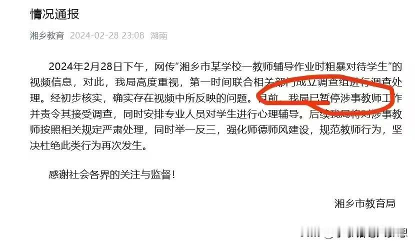 湖南老师殴打学生,招招狠毒,因为刚入职不久的老师看不过眼,拍了个视频发网上反遭威胁,还好连央视都看不过眼了,老师的老底被扒光了! 2月28号下午,一段湖南湘潭市栗山镇金泉学校,一名老师因为学生不会做题,粗暴对待两个孩子的视频被爆出来,视频迅速在网上流传,并引起了全网热议。 这段视频是一位新来的老师偷拍的,因为看不惯老师这样粗暴对待学生的行为,所以曝光网络。 从这位老师偷拍的视频中可以清楚的看到当时至少有两名老师坐在烤炉边批改学生的作业。 一名穿白色衣服的老师,一名穿棕色衣服的老师。 视频中一名穿棕色衣服的老师撕裂着嗓子去训斥一个女孩子,推搡孩子,用作业掴掌孩子,揪孩子耳朵,揪孩子脸蛋,撕扯孩子头发,简直粗暴至极! 孩子被打的站不稳,惊慌失措,一直哭泣着,不敢反抗,真的看的人揪心,这老师的行为令人不寒而栗。 女孩在一旁抽泣,边上穿白衣服的老师居然对着女孩说:“你不要哭,收住,不然我就要告状了!” 女孩收住了哭泣声,退回在一旁修改作业,这时候来了一位穿蓝色衣服的男孩子,这位棕色衣服的老师拿着男孩子的作业就甩到了这名女孩子的脸上,然后看了男孩子的作业,发现男孩子也做错了,就揪着他的脸,随手把他的作业丢在地上。 男孩捡起了作业,退到了一旁去做修改。 穿棕色衣服的女老师又扯着女孩的头发来回的撞,生气的又把女孩的作业给丢一边去,女孩害怕的去把作业捡起来,在一旁又哭了起来,边穿白色衣服的女老师又发声了:“别哭了,安静一会,看来我要去告状了!” 视频中,这位穿棕色衣服的老师还对这两个孩子进行了言语的侮辱:“你是猪吗?”“你是瞎了吗?”“读书?你配读书吗?”“你这个蠢货!” 事后要有家长爆出聊天记录,原来棕色衣服的老师是六年级的班主任教数学,白衣服的老师是六年级的语文老师兼班主任。 数学老师,杨倩,32岁,家长们都反映这个老师一直都很凶,班上的同学都非常的怕她,而且这位老师已经不是第一次这样打学生了,说话还非常的难听。 本以为这位老师都够牛了,没想到她事后不觉得自己有问题,还找到了拍摄视频的老师,并对这位老师进行了威胁! 因为拍视频的这一位老师是这个学校的新老师,所以这位老师以她的前途做威胁,大概的意思:校长说的话你都不听,小孩子就不应该那么脆弱,我们是在帮他茁壮成长而已,出了社会才不容易受到打击! 你不用多管闲事,只要你把视频删了,那你就可以转正,但是如果你得罪校长,那就不好说了,你会被赶出这个行业! 真是大开眼界!原来学校里的江湖也是这么险恶的! 视频经过舆论发酵,当地教育局也做出了回应:“已经查实,涉事教师按规定暂停工作,接受调查,安排专业人员对学生进行心理辅导。 对于老师的这种做法,网友们也持不同的意见,有的网友觉得:“现在的学生太脆弱了,我们以前老师是拿着戒尺上课的,同学们也怕挨打,所以上课很认真,现在的老师稍微动一下手就不得了,我得感谢我以前的老师,不然不会有现在的我,我就是读书改变命运的那个人!” 有的网友就表示:“这个老师从上到下都那么嚣张,在那样的公开场合,也敢这样动手,可见平时的行为是多么恶劣,这样的人就不适合当老师,应该公开道歉,开除,取消资格证!” 我想说,我也是当家长的,我不反对老师管教学生,但是这是在管教孩子还是在侮辱孩子? 这位老师所表现的行为并不是教育关爱孩子,而是厌恶仇恨孩子。 视频中的老师几乎疯了的状态,声音拉扯到令人觉得刺耳,每一招都很狠毒,这跟校园霸凌没有什么区别!这对孩子的心理伤害会更大。 学习真的是讲天赋的,这种教育方法真是大错特错,有一些孩子,他理解能力可能有点欠缺,明明孩子就很怕你,然后你还打骂他,而且还一再逼问,那种状态,他的脑袋肯定是懵逼的,还怎么去学? 要讲究教育方法,多一些鼓励,多一些沟通,我觉得就会慢慢的有所进步,老师真的一定要控制好自己的情绪。 还有我想批评一下这位穿白色衣服的老师,真是麻木不仁,助长歪风邪气! 对于这件事情,央媒也发表了看法:这位老师师德出了很大的问,“必须整改绝不能让不符合为人师者的言行误人子弟!”我觉得他们整个学校都得整改,都被这些人的歪风邪气给污染了! #记录我的2024# #我来唠家常#