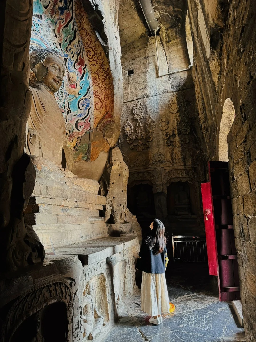 响堂山石窟开凿于北齐,当初皇家举全国三分之一财力修建,可想而知耗费了多少心力。石窟分为南北两处,现存16座洞窟,北窟震撼、南窟精美,建议都看。 . ☑️北窟有三个很大的洞窟,大佛洞、释迦洞、刻经洞。大佛洞的规模之大之完整都超出了我的预期。三面佛通高5米,阳光从高处的洞口照射进来,鸽子在佛像四周飞舞,场面震慑心灵。 《资治通鉴》记载,北齐皇帝高欢的灵柩曾经藏于右侧佛头顶上的石穴中,可惜如今已无从考证。