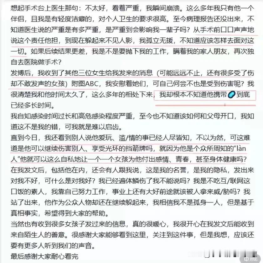 实锤大瓜!真的不是得不说,娱乐圈真乱,乱的让人难以想象,这是继吴亦凡后又出一单大丑闻,多位女生感染HPV病毒。 一位自称为说唱歌手满舒克的女友爆出自己因与满舒克交往得了HPV病毒,她说自己在美国就打了九价,但是还是得了,她去看医生,医生告诉她打了九价会康复的,结果情况越来越糟,她也把这个事情告诉了男友,男朋友承认这是他传染,他说他会负责,结果当天做手术还迟到,也没有嘘寒问暖,钱也没有结。 她一气之下就把这个事情发了微博,结果有几个女生联系她说自己也遭受了同等的待遇。 她们也相继感染了HPV。 她说自己又不是吃互联网这碗饭的,虽然有损声誉,但是为了阻止其他女性因为他受到伤害,所以选择了站出来揭露这个秘密。 看了之后真的觉得,贵圈还是要讲一下道德,虽然大家都是亲戚,但健康还是很重要,还有那些无知少女,还是远离一些这种玩的可溜的嘻哈歌手吧! 我这里有几个疑问,我想问一下大家,打了九价,还可以感染HPV吗?HPV也分很多种吧,有一些不是可以治愈的吗?而且一定是男性传染的吗? #春日生活打卡季# #记录我的2024#