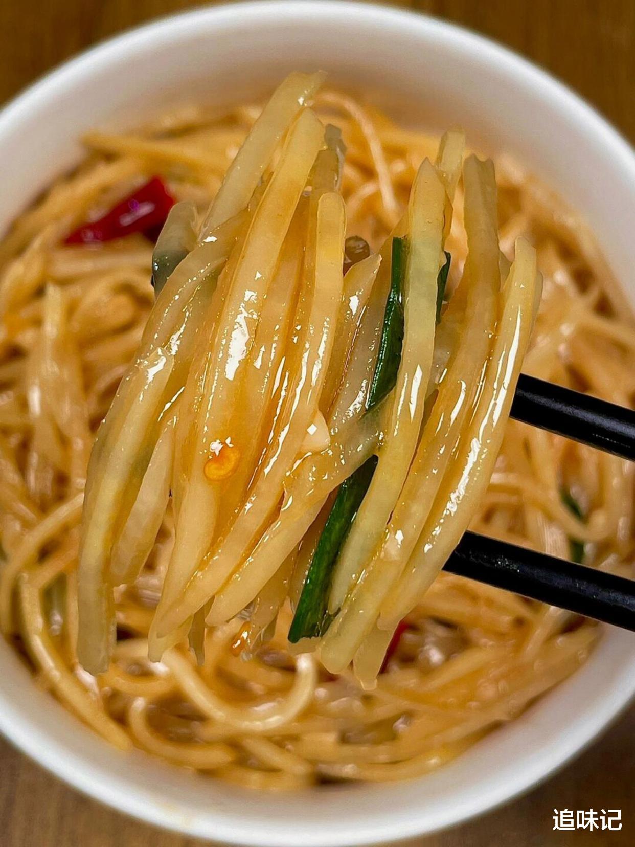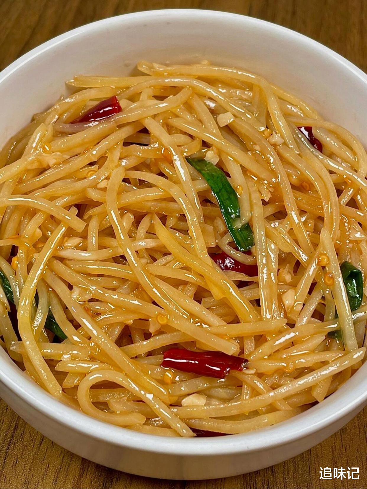 土豆丝切得细细的,脆爽可口。酸辣的酱汁完美包裹着每一根土豆丝,酸中带辣,辣中带香。葱段的清香和干辣椒的刺激让人食欲大开,是一道非常开胃的家常菜。