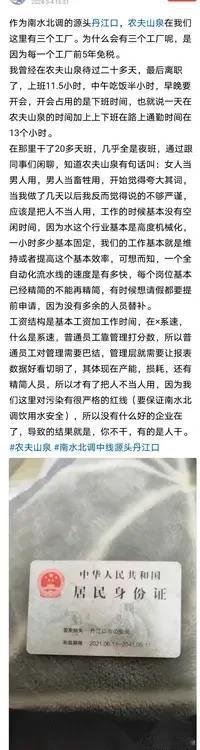 终于知道为什么同等的销售额,农夫山泉纳的税是最低的,一位在牡丹江的网友讲述了个中缘由和自己在农夫山泉经历的一切。 他说牡丹江就有三个工厂,靠不停的开工厂占用免税政策的优势,三免两减半,用完名额然后又办新厂又有就免税。 他说自己在里面做了二十多天就不做了,真是杠不住,管员工奇严,不当人看。 这名男子是晒出了自己身份证背面确认是牡丹江的。 税收方面我觉得他说的应该没有问题,资本家都想占用免税的名额。 至于他说的工作不当人看,这个因为没有在里面做过,所以不清楚。 但是我真的没有在网上看到娃哈哈的员工说娃哈哈的不是。[捂脸] #春日生活打卡季# #记录我的2024#