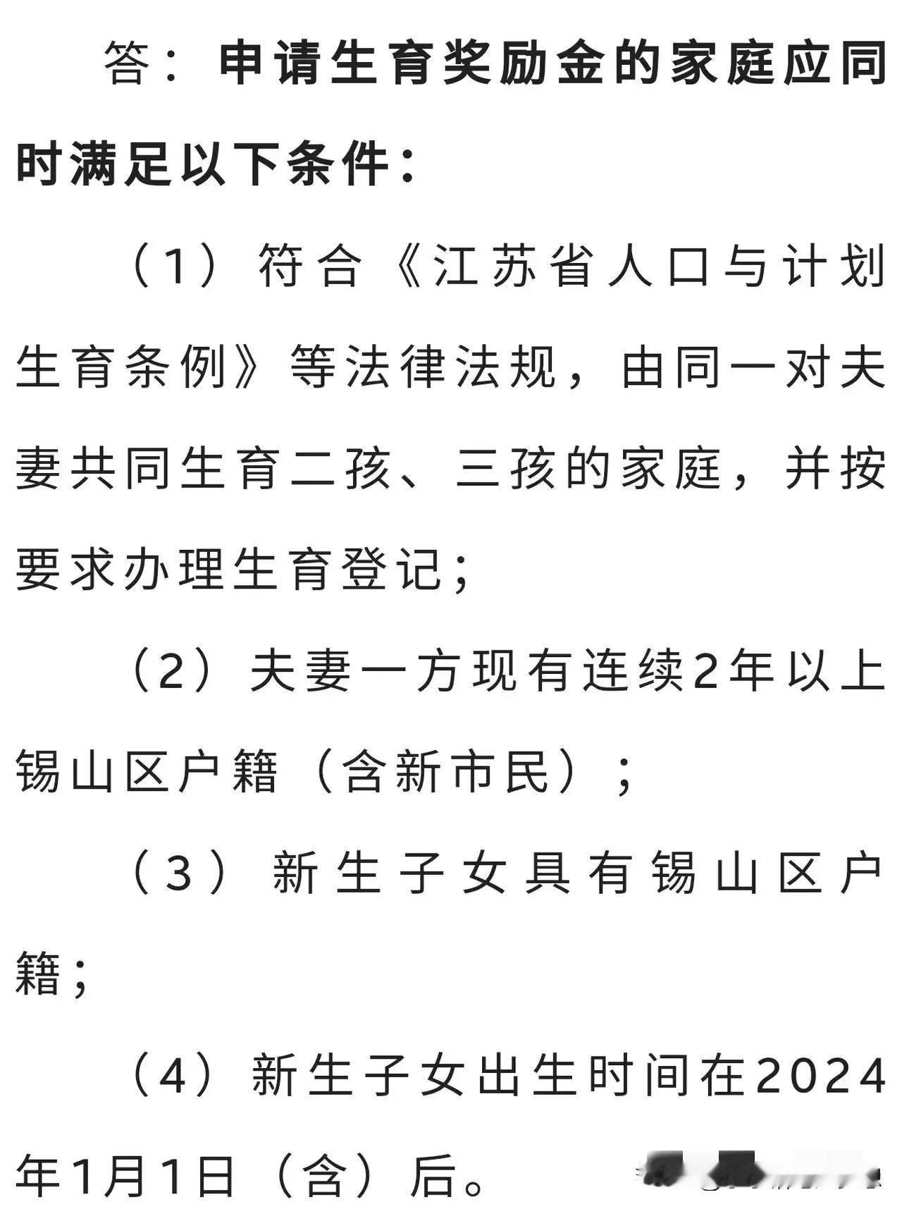 无锡硬核了!无锡发布了最新三胎政策,二孩家庭奖励15000,三孩奖励40000!!! 出这个政策无非就是鼓励大家积极生育,现在这个政策是属于试运阶段。 试运期为三年!试用时间从2024年1月1日开始到2027年的12月31日止。要求是本地户口2年以上。 不得不说,这个奖励真的挺诱人的,毕竟四万块钱也不少了,能够解决孩子生活上不少的开支了。 现在是先从无锡的锡山区开始,接下来应该会陆续开放各个区,全国各地应该也会陆续开放一些鼓励政策,让大家积极响应,提高国家的生育率。 如果你所在的地区也实行三胎奖励40000,你会生吗? #春日生活打卡季# #我来唠家常#