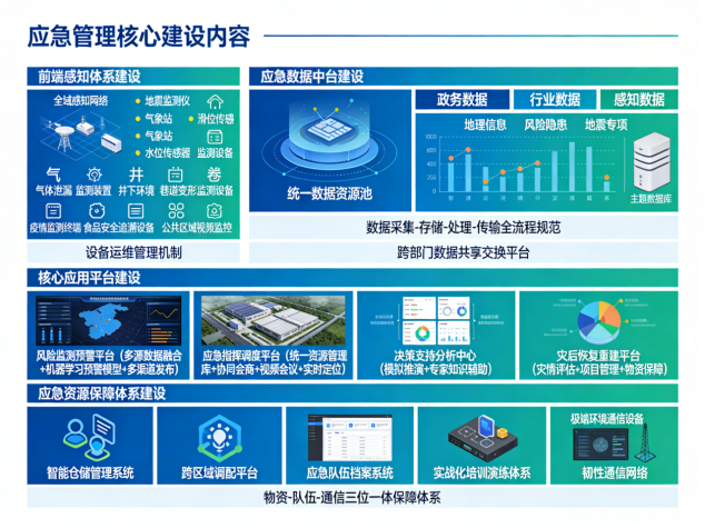 四、核心建设内容1、前端感知体系建设全域部署感知网络,实现多场景全覆盖:在自然灾害领域,针对地震、气象、水文、地质等灾害类型,布设地震监测仪、气象站、水位传感器、滑坡位移监测设备等;在事故灾难领域,聚焦危化品存储区、矿山、交通枢纽等重点区域,安装气体泄漏监测装置、井下环境传感器、巷道变形监测设备等;在公共卫生与社会安全领域,部署疫情监测终端、食品安全追溯设备、公共区域视频监控等。同时建立感知设备运维管理机制,保障设备稳定运行与数据质量。