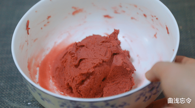 食材:黄油130g、糖粉60g、全蛋液60g、低筋面粉180g、奶粉10g、抹茶粉3g、红曲粉3g