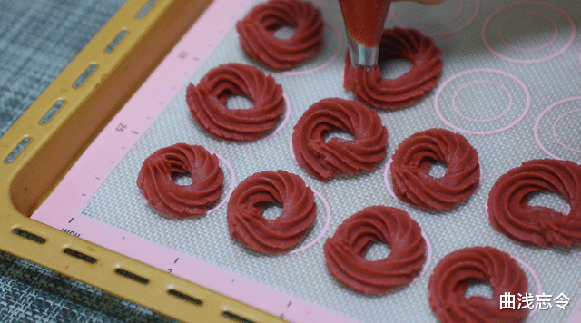 6、造型:烤盘中垫上烤垫,挤上花环形状。(此时烤箱提前预热,180度预热10分钟)