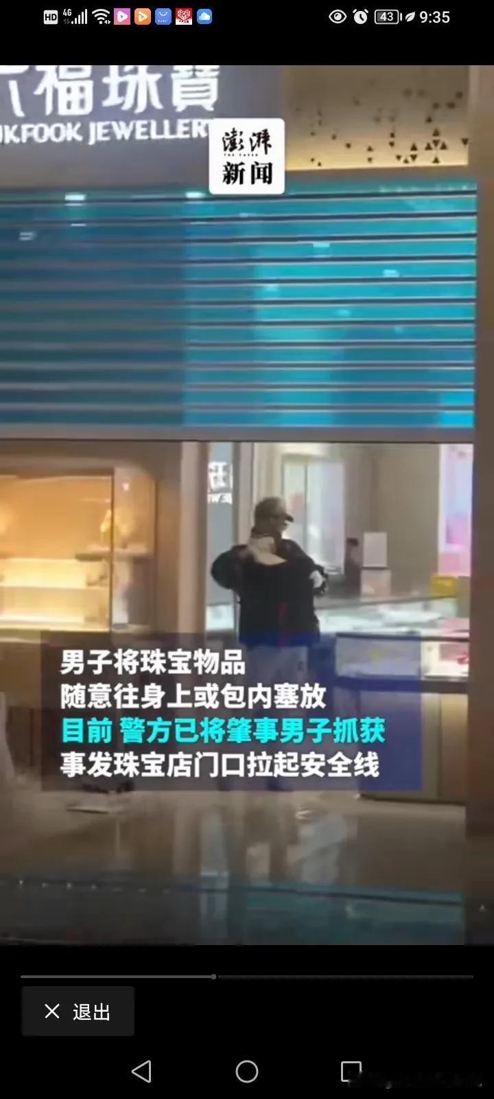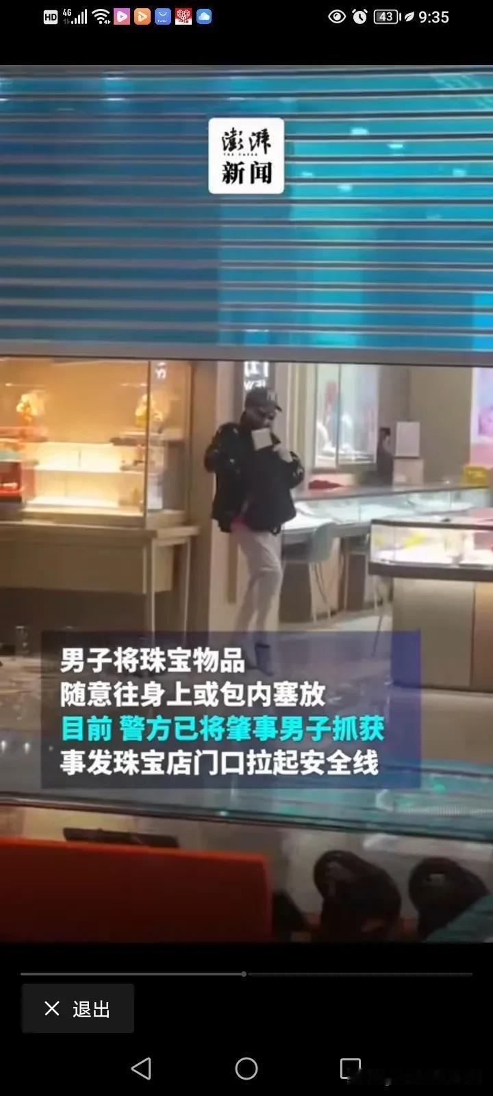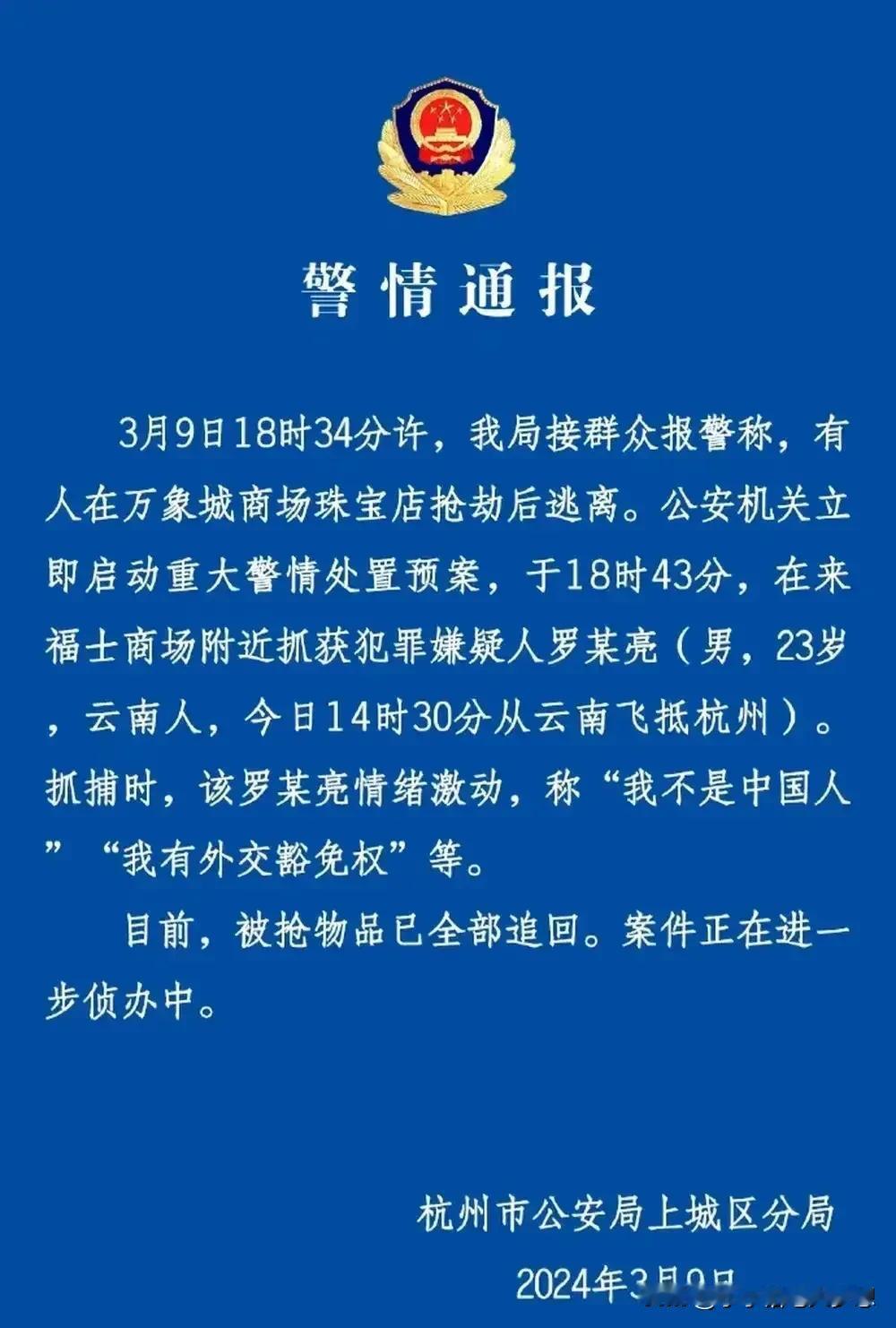 太猖狂了!光天化日之下,居然在金店抢劫!而且还大喊:“我不是中国人,我有外交豁免权”,3月9号18点34分,杭州上城区万象城一家珠宝店前,一名男子拿着一个榔头,使劲的敲打玻璃陈列柜。现场的玻璃被敲碎一地。 周边有不少的群众看见了之后都被吓跑了,离得远一点的就拿起了手机,拍起了视频。 男子砸了两个柜子后,打开了自己的背包,抓走了里面的金饰,准备逃跑。 还好,现场的人及时报了警,仅仅9分钟,警察就把他抓住了,抓他的时候,他非常的激动,疯狂的大喊“我不是中国人”“我有外交豁免权”等。 据上城区公安的警情通报获知,该名男子为云南人,23岁,下午2点30分从云南抵过杭州。目前所有失物已经被追回。 案件还在侦查中。 最近金价暴涨,这名男子可能因为这个原因想要不劳而获,但是我觉得他可能精神有问题,选择这么大个商场作案那能逃得掉,现在到处都是摄像头,每个人都举着手机,大数据这么厉害,他能逃得掉? 而且他明明是云南人,怎么会在抓捕的时候说出那样的话呢? #记录我的2024# #春日生活打卡季#