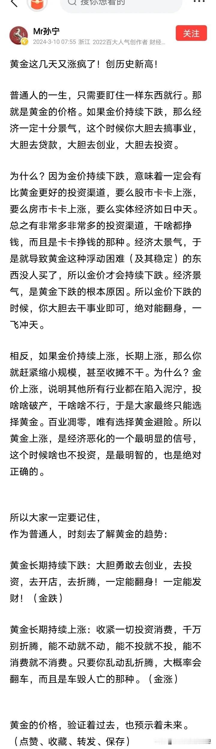 一直觉得黄金涨价不是一件好事情,直到今天看到大咖孙宁也发表了这样的观点,他说黄金长期持续下跌,意味着一定会有比黄金更好的投资渠道,可以大胆的去投资。这是一个市场经济好转的信号。 如果金价持续上涨,这是一个经济恶化的信号,就证明所有的投资项目都已经不景气了,房地产已经拉垮了,唯有投资黄金可以避险。 他的观点我同意的,而且我还觉得黄金的持续上涨还预示着动乱与战争。乱世买黄金,不是没有道理的。 #春日生活打卡季#