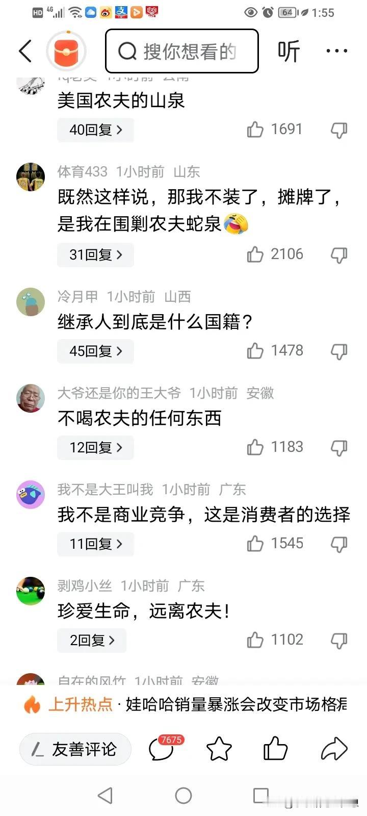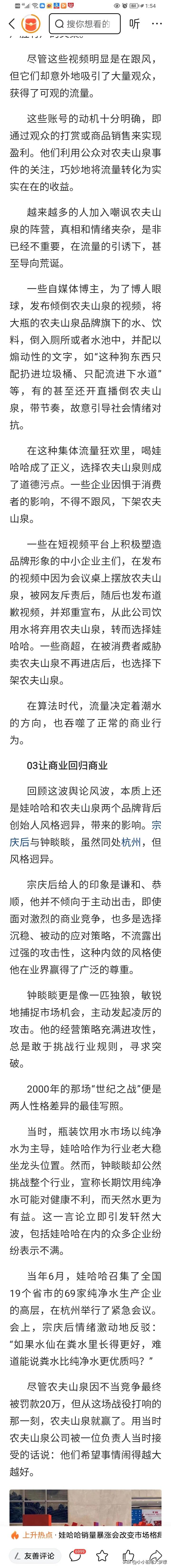 继浙江多家官媒为农夫山泉发声后,最具权威的官媒之一凤凰网也发声了:1、狠批网络恶意攻击,造谣传谣。2、农夫山泉是无可争议的民族品牌,只要为消费者提供好产品,那就应该是好企业。3、原本是一场商业竞争,却演变成一场情绪的裹挟,然后对农夫山泉巫猎。 这件事情我是这么看的,不可否认,可能有一部分人为了流量会有抹黑的行为,但群众也不是傻子,心目中都有一杆秤。 这真的不是水好不好喝的问题,也不是说捐款不捐款的问题,更不是包装设计的问题,其实中国人历来不仇富,仇的是为富不仁的富人。 大家是看到宗庆后老爷子的正直善良、有社会责任、低调,不恶性的争夺市场,他不辞退45岁以上的员工,他为员工提供廉租房,他最伟大的是挣到钱之后,他反哺了社会,解决了就业,房子等大问题,一直默默地为国家社会、职工做出的贡献从来不高调宣扬,所以老百姓被感动了。 老百姓眼睛是雪亮的,同时也是对社会上了一课,企业家,得有家国情怀,对社会做贡献,自然而然就会得到群众的尊重和拥护。 #春日生活打卡季# #我来唠家常#