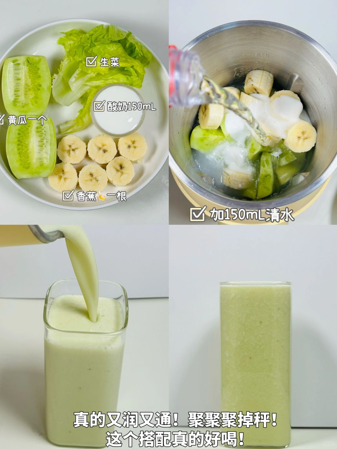 1️⃣黄瓜🥒一个➕香蕉🍌一根➕生菜3片➕酸奶150mL➕清水150mL(这搭配真的好好喝)