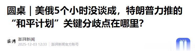 在万众瞩目之中,美国和俄罗斯终于在莫斯科进行了第一轮接触,但遗憾的是,12月3日当天,俄罗斯总统普京与美国特使威特科夫以及特朗普女婿库什纳在谈了5个多小时以后,仍然谈崩了。