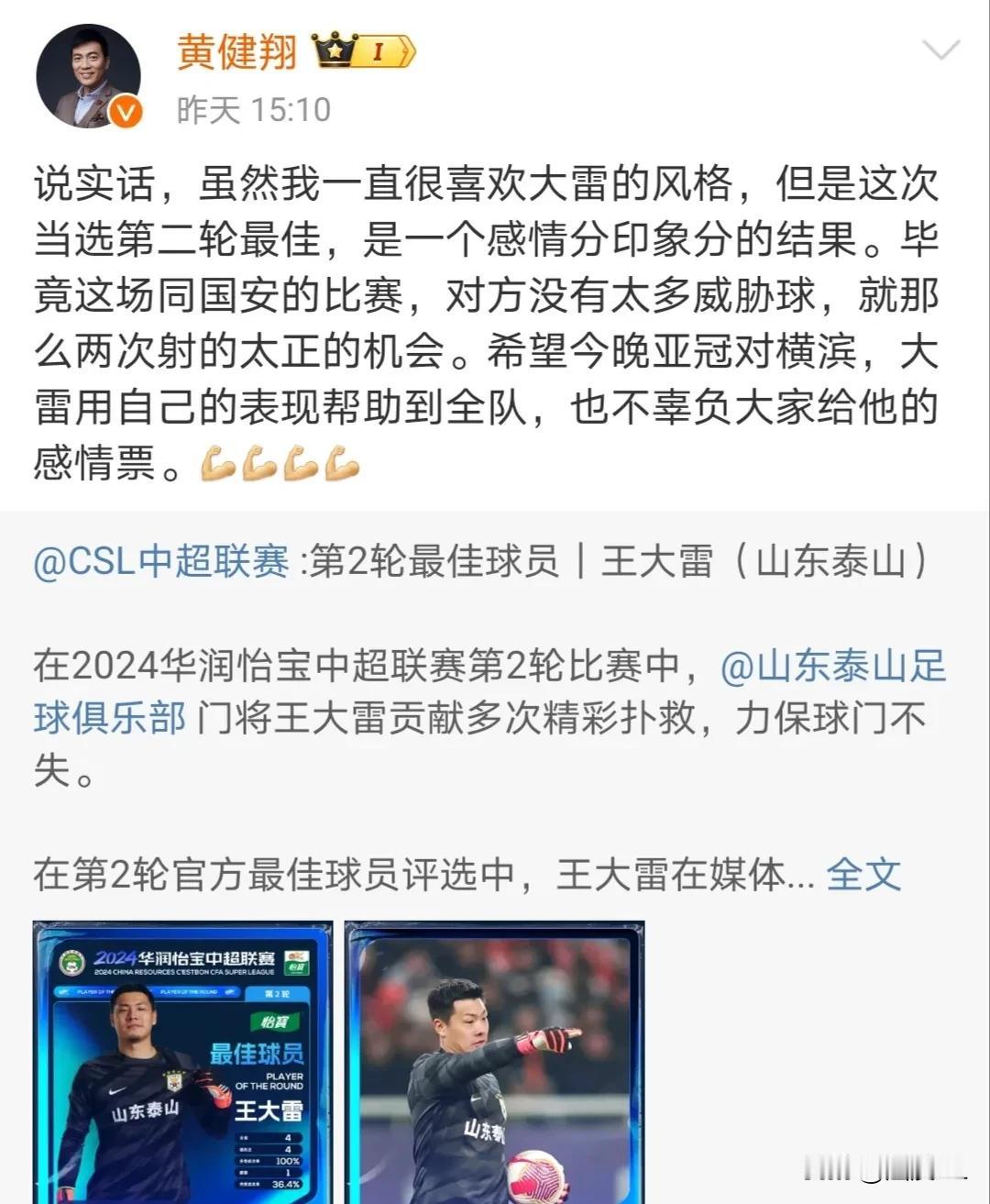 王大雷受之有愧?黄健翔:王大雷当选第二轮最佳,是一个印象分感情分的结果。 面