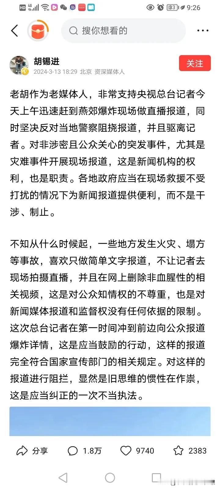 河北燕郊爆燃事故,央视记者被拦截,官方已出通告表示歉意,刚开始的时候是被采访的,央媒也做了直播,可是到后来所有记者都被驱赶了。 胡锡进针对这件事情愤怒的发表了文章谴责当地政府这种行为不当,当地应该要积极支持和配合让记者真实反映救援情况,并回应民众的关切,反对滥用执法权。 当地政府称驱赶记者的原因,不是想隐瞒实情,而是经过专家组的勘测,发现还有天然气泄漏的风险,为了保障大家的生命安全所以决定全部驱赶所有的非救援人员。 因为一线工作人员的沟通能力不行,方式方法太过于粗暴,所以造成了误解和舆论。 他们已经向相关的记者道歉,通过这件事情,他们也发现了自己的短板,也会调整和完善相关的工作机制,在保证安全的情况下为采访记者提供更多的便利。 其实我觉得当地政府这个出发点是正确的,毕竟是保护记者的人身安全,以免造成二次伤害,但是我想说,十几个人包围着 3个记者,长时间推搡,确实是简单粗暴。 所以我觉得沟通还是出问题了,肯定中间沟通没有清楚说明里面的危险情况?? 这些实战在一线的记者,不是一般人能当的,都是经历过生死,特别是央视记者,都清楚现场的危险性,他们是勇敢,但是也怕死,所以都会遵守和配合现场的管理,也不会去添乱,所以还是应该要约定一个规则,记者的采访肯定是要继续的,搜救也不能耽误,所以要取一个折中的办法。
