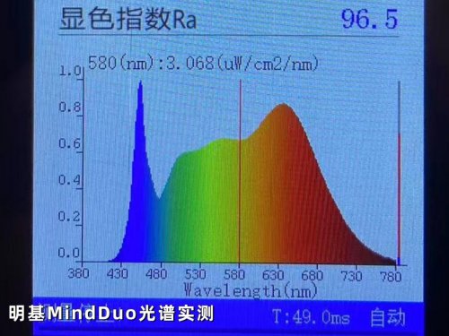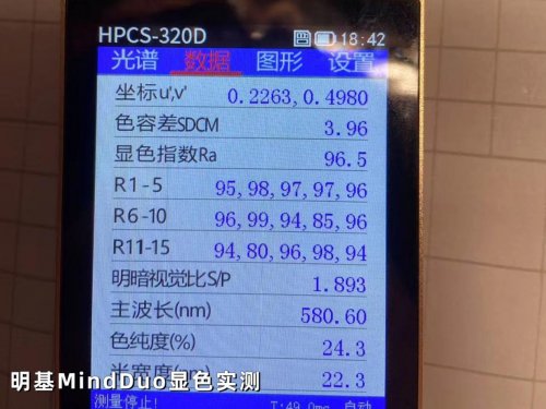 明基MindDuo实测显色指数Ra96.5,能满足日常学习的色彩辨识需求。但饱和红色R9仅85、饱和蓝色R12为80,色容差SDCM为3.96,整体色彩还原的精细度还有一定的提升空间。