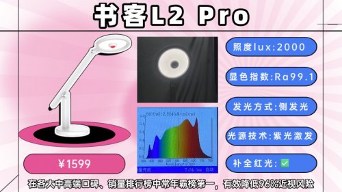 这次测的书客护眼台灯L2 Pro 是它家的当家旗舰,一共集成了16项护眼黑科技,主打的就是极致护眼性能,是唯一做到降低96%近视风险的同时,缓解92%用眼疲劳,光源99.8%高度还原自然光的护眼灯款式!