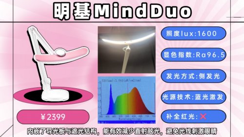 与前两款的紫光激发技术不同,明基MindDuo采用传统蓝光激发技术,实测在4000K色温下,其蓝光峰值在 1.0 附近,在三款对比产品中数值最高,同时也不红光养眼等功能。它的护眼策略其实更偏向于通过智能调光、定时提醒等功能来引导孩子的健康用眼习惯。