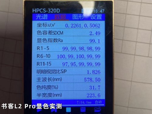 在色彩还原方面,书客L2 Pro遵循严苛的TM-30光学标准进行调校,实测结果显示它的显色指数 Ra高达99.1,饱和红色指数 R9和饱和蓝色R12都达到了90+的优秀水平,色容差(SDCM)也控制在2.49的优秀水平,尤其适合绘画、阅读等对色彩敏感度高的场景。