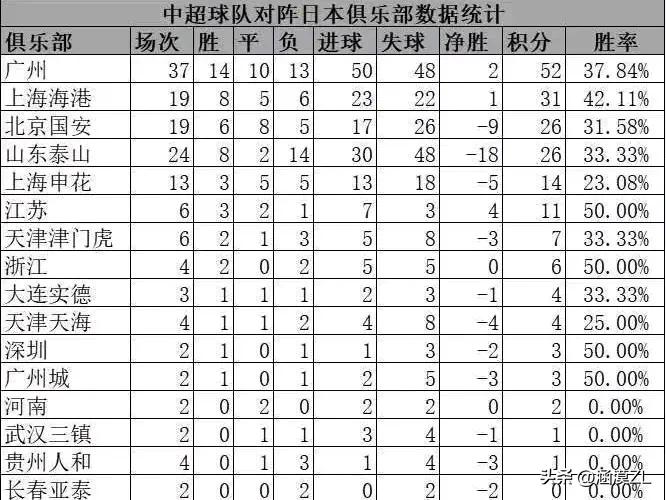 国家队“恐韩”,中超队“恐日”?上海海港战绩最好。 截止目前,中超球队共计和日职联球队交手149次,战绩为50胜40平59负,胜率33%.56。 按交手次数排名前五中,上海海港胜率(42.11%)最高,其次是广州队(胜率37.84,已降入中甲),山东泰山以33.33%的胜率排名第三(24场8胜2平14负)。 按交手次数排名前五: 广州队,37场,14胜10平13负,胜率37.84%。 上海海港,19场,8胜5平6负,胜率42.11%。 北京国安,19场,6胜8平5负,胜率31.58%。 山东泰山,24场,8胜2平14负,胜率33.33%。 上海申花,13场,3胜5平5负,胜率23.08%。