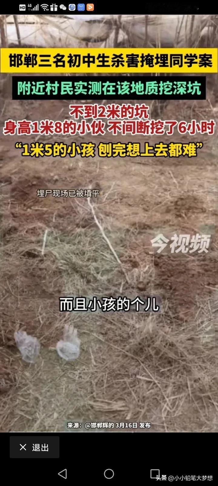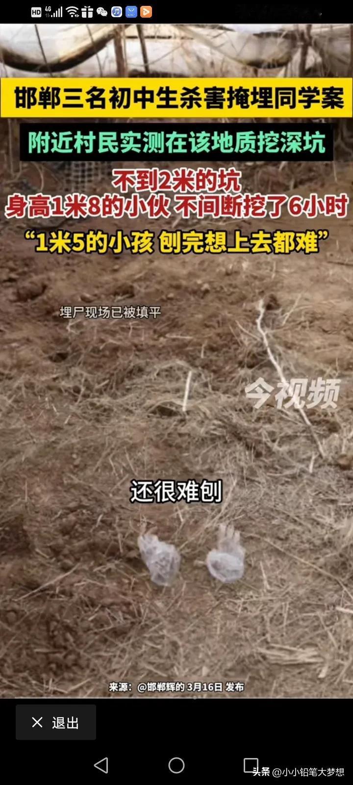 河北邯郸初中生被杀掩埋案,一名附近的村民通过自身行动,实测去挖一个不到两米的坑,他说这里的土质都是非常硬,非常难刨,他身高一米八,一个早上都在挖,没有停过,他用了将近六个小时,才挖出图中这样深的坑,他说三个小孩最高的才一米五,绝对不可能在短时间内挖出那么深的坑! 而受害孩子的爸爸也带了律师团队过去亲测,还是到事发地大棚里面去测的,所以说是土质是一样的,他们几个大人轮流挖了短短几分钟,土实在太硬,手都被磨红发疼,他说连大人都觉得非常挖,这小孩是怎么做到的? #春日生活打卡季#