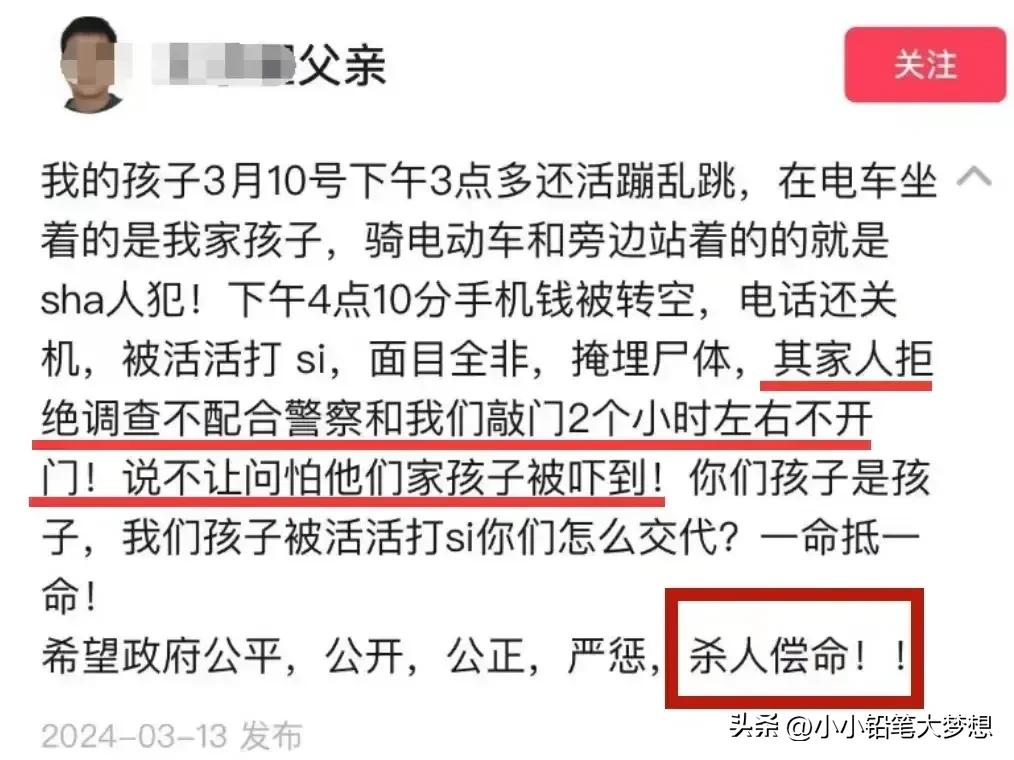 初中生被杀案,孩子的爸爸刚刚又发文了:“等爸爸给你报仇雪恨!”尸检刚刚结束,孩子的爸爸说比想象中还要残忍,我怕这位爸爸可能会出现极端行为! 这位爸爸说,尸检进行了四个多小时,但是他没有害怕,一直陪着孩子,心很疼,也充满了愤怒。 当天挖尸的现场,当时只让一个家属看,舅舅看完之后说面目全非,而村支书说面部全都是血,接着姑姑接受cctv 12的采访中说,全都是大铁锹的大伤口,眼珠子都外翻,腿脚都是肿的! 这是非人的折磨呀,当看到最亲的人受到这种折磨,这种痛苦是无法想象的,所以导致了妈妈两次因为伤心而昏厥,进医院插管! 现在真的希望孩子的爸爸能够冷静下来,采取法律手段来处理,一定要理智,不能冲动,因为他还有个大孩子,还有家庭,还有父母,我知道他内心肯定很难受,但是一定要相信法律,现在这个事情已经心动了全国,央视新闻和人民日报都发了视频,相信会有一个我们都满意的答案,可怜的孩子也能安息了! #记录我的2024# #我来唠家常#