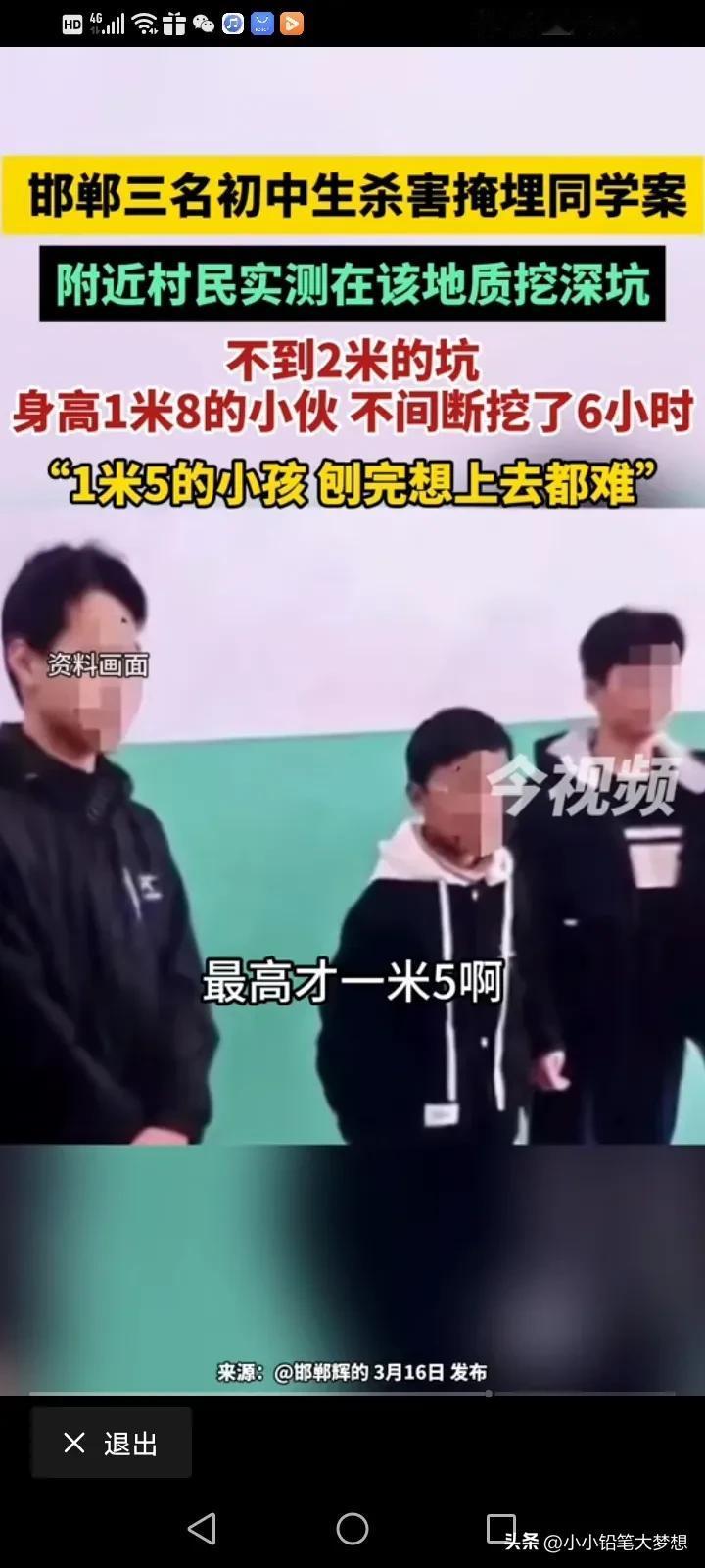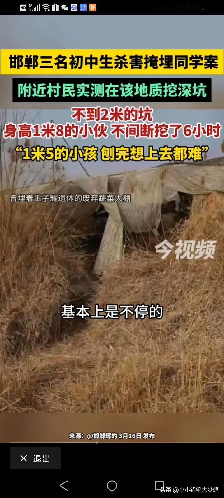 初中生被杀害案爸爸发声“等爸爸给你报仇雪恨!”孩子爸爸说尸检已经结束了,进行了四个多小时,比想象中还要残忍,他一直陪着孩子,但是没有害怕,心里只有心疼和愤怒。 初中生被杀害案,真的刷新我的三观,这三个孩子怎么可以如此的心狠手辣,丧心病狂,孩子的舅舅说孩子面目全非,村支书说,那脸上都是血,不堪入目,姑姑在接受央视12台采访的时候说简直太残忍了,脸上都是铁锹划的大口子,打得眼珠子都外翻了,腿脚都是肿的! 昨天他爸爸带着律师团队实地踩点埋尸的蔬菜大棚,三个大男人亲测挖土,挖了仅仅几分钟,他们的手就已经开始起泡,发红,疼痛的不得了,他发文说:“大人挖都难,很困难,小孩是怎么做到?” 同村的一个一米八的男子也测试过了,如果要挖一个那么深的大坑,他花了将近六个小时,而且这三名学生最高的才一米五,他们是如何做到的? 是啊,三个孩子都是留守儿童,都是爷爷奶奶看着的,又怎么舍得孙子下地干农活呢?那不干农活的孩子,他是怎么能做到的呢? 好怕这位爸爸一时冲动,会做出极端的行为啊!现在这件事情已经轰动全国了,央视已经报道了,压力也给到了河北警方了,我觉得是三名小孩不会轻判的! 希望这位爸爸能够冷静下来,采取对自己最有效的办法来解决,你要考虑到自己现在还有一个家庭,还有一个孩子,还有自己的父母和亲属,不能冲动,相信法律,一切都会有好的结果的,会等到给孩子讨回公道的那一天! #我来唠家常#
