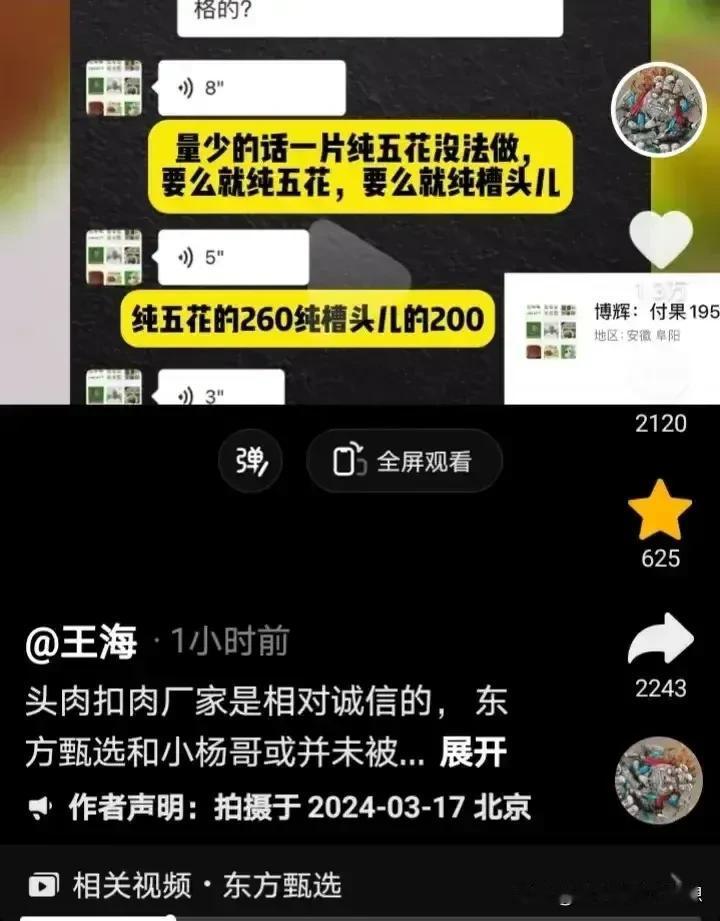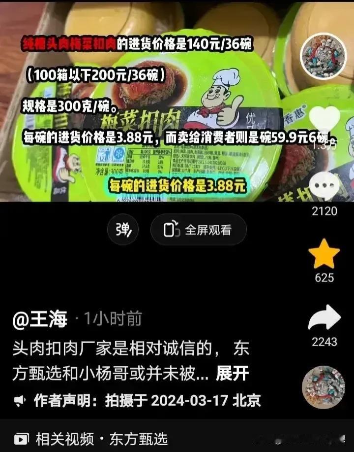 小杨哥,他们终于站出来说明315曝光梅菜扣肉的事情了,他说他们第一时间联系了生产方和销售方,但“线上产品未违规使用槽头肉”。 他说会让厂家尽快提供证明材料!而且公司已经启动了消费者登记和先行垫付退款工作。 他卖的梅菜扣肉是,59块九六盒,平均一盒不到十块,还包邮,这里面还包含了厂家的利润和他的坑位费,正常的五花肉是12块钱一斤,工厂水电,员工工资,原材料,包装,运输等等,给到消费者还不到十块钱一盒,这么算下来,那工厂是没钱赚啊?没钱挣的工厂还会做吗? 王海说,工厂出货的时候肯定会跟销售商说清楚,这是五花肉还是槽头肉的? 王海说,小杨哥他们可能早就知道这些肉是用不好的肉。 #记录我的2024#