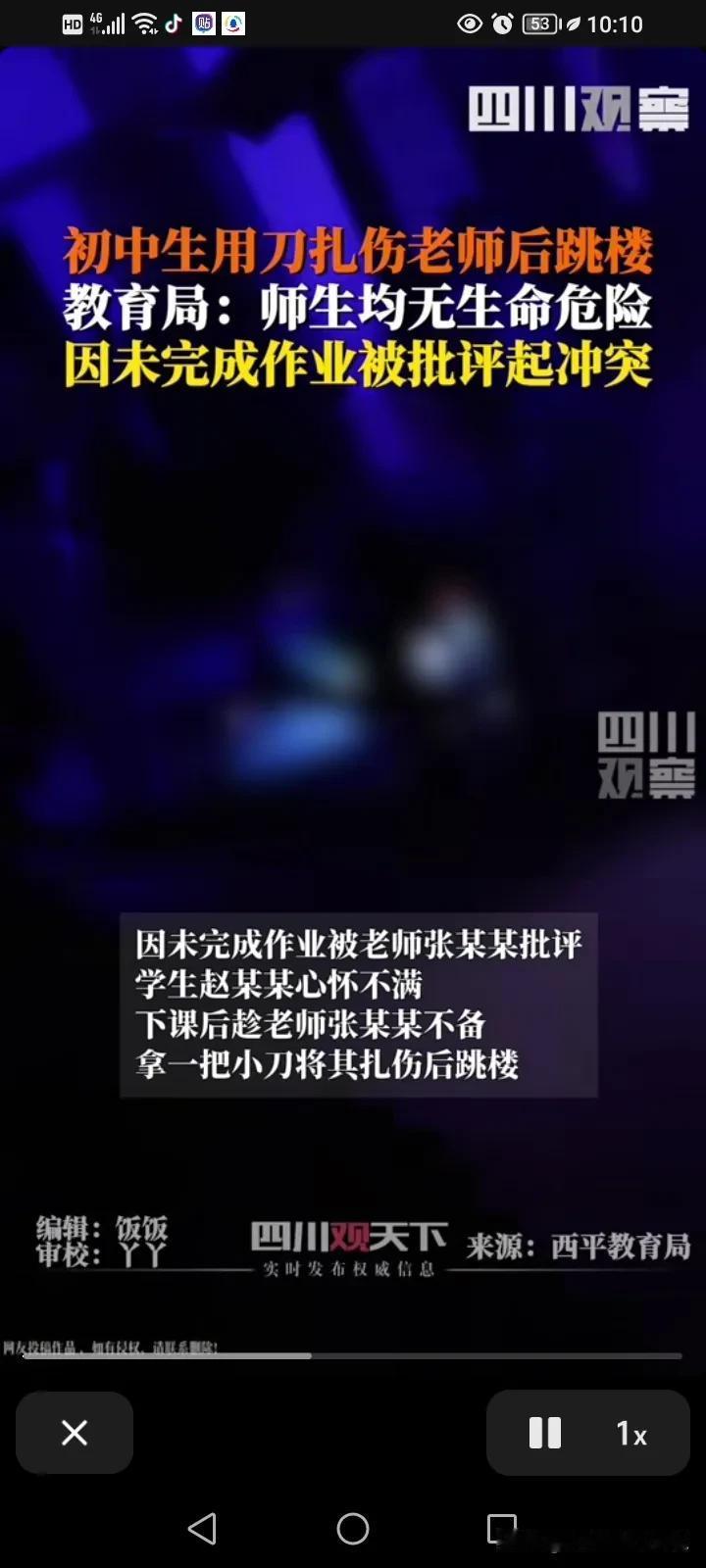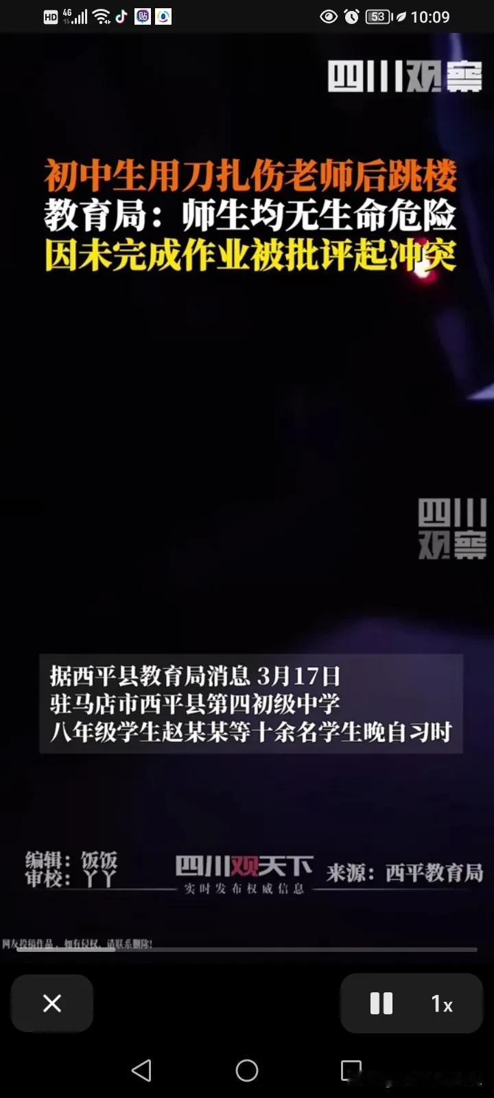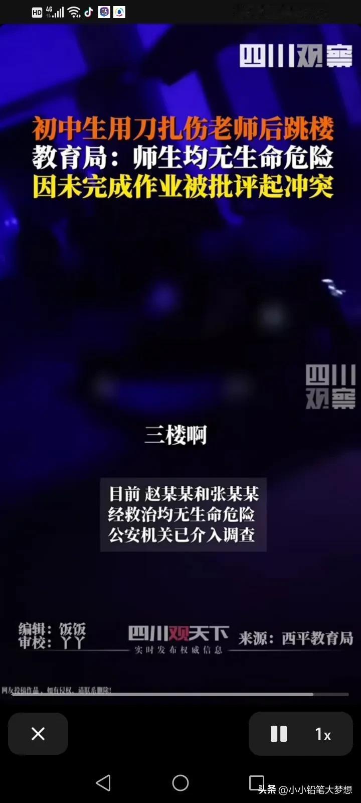 现在的初中生都怎么了?河南一名中学生用刀扎伤老师之后跳楼了!3月17日晚8点半左右,河南驻马店,西平四中的一名8年级的学生因为没完成老师布置的作业,被老师批评了,等老师下课之后,他趁老师不备,直接从抽屉里面拿出一把刀,直接捅向老师的头部和背部,捅完之后,他从三楼一跃而下! 还好,老师和学生被紧急送去医院救治,两人均无生命危险。 不得不感叹,现在的初中生的心理都怎么了?这真的是逆天了,连老师都敢扎,扎完之后,一地都是血,他可能知道自己犯法了,然后从三楼一跃而下,还好,楼层并不是很高,人还救得回来。 我真的陷入了沉思,这样的学生老师该不该管?应该怎么管?老师没有执法权,不能采取强制措施,只能通过口头教育,但是这样的学生,他能听得进去? 最终最受伤害的还是这名老师,被捅了,估计还得为学生的跳楼事件负责。 最近,邯郸初中生杀害案真的让我觉得现在的初中生心里已经扭曲了,青少年的心理健康已经到了不可忽视的地步了,强烈建议初中生把专业心理课排上,帮助他们渡过青春期。 还有,教育应该是家庭、社会、学校三合一的,都不可以缺失了,往往发生这样的事情,家长会把责任全部推到学校去,其实是不合理的。 #我来唠家常#