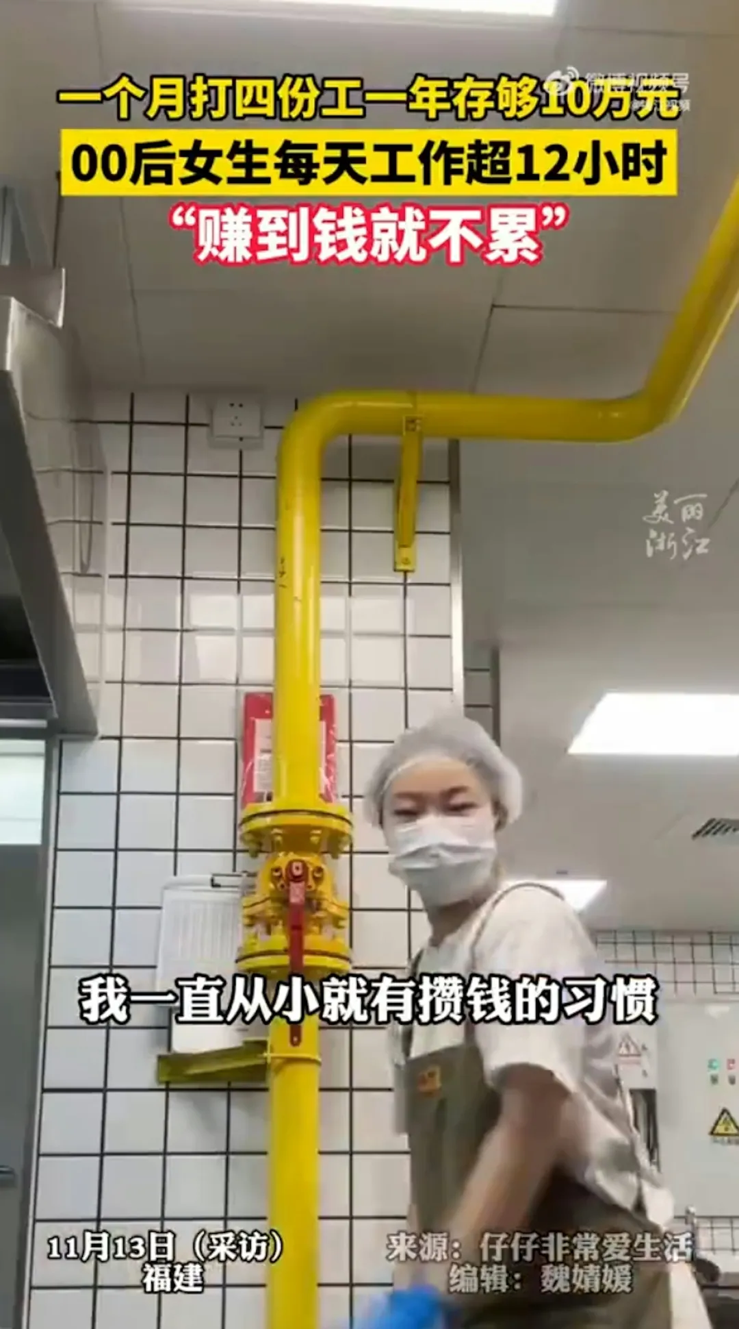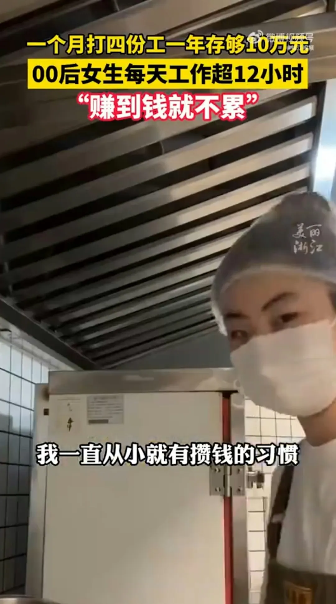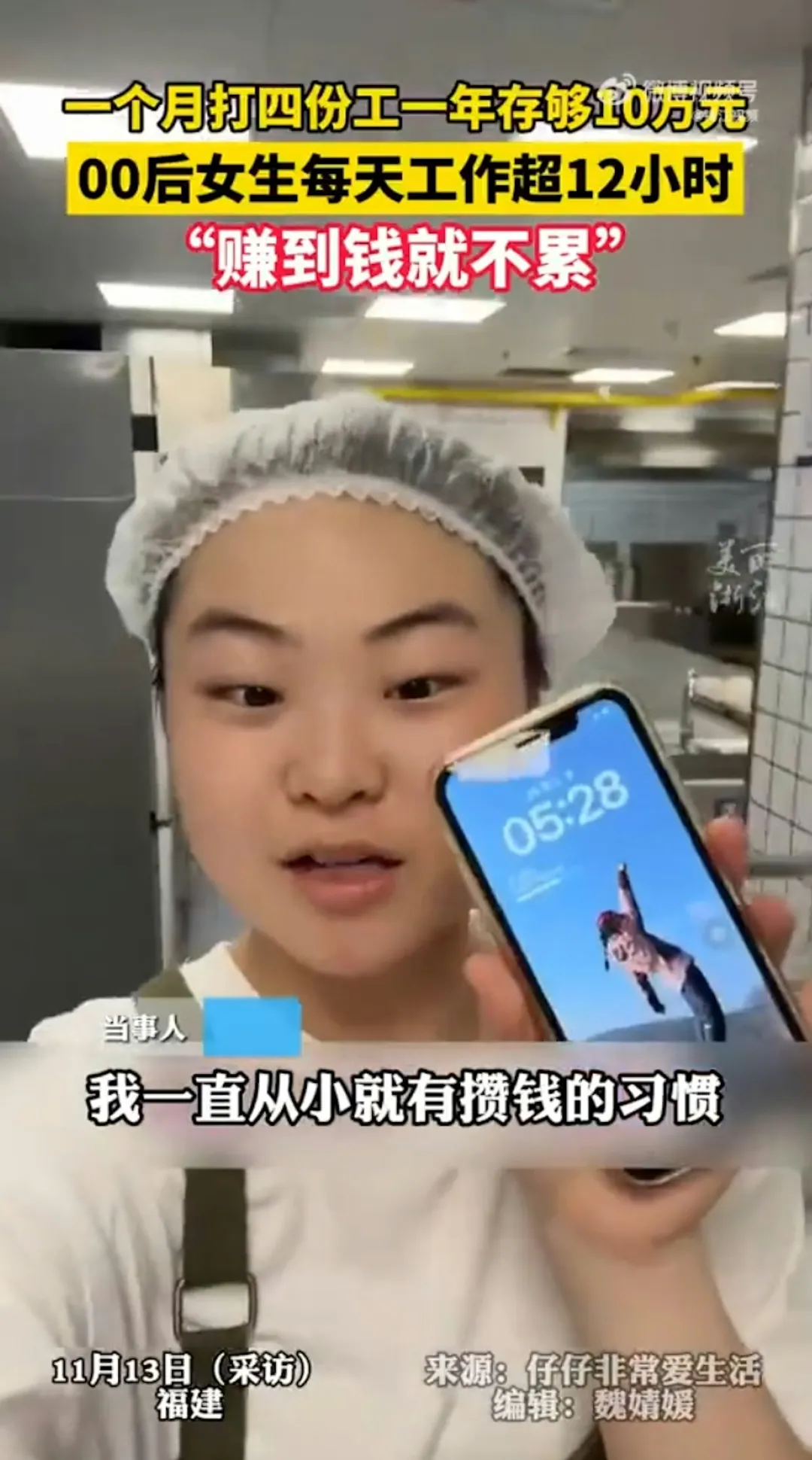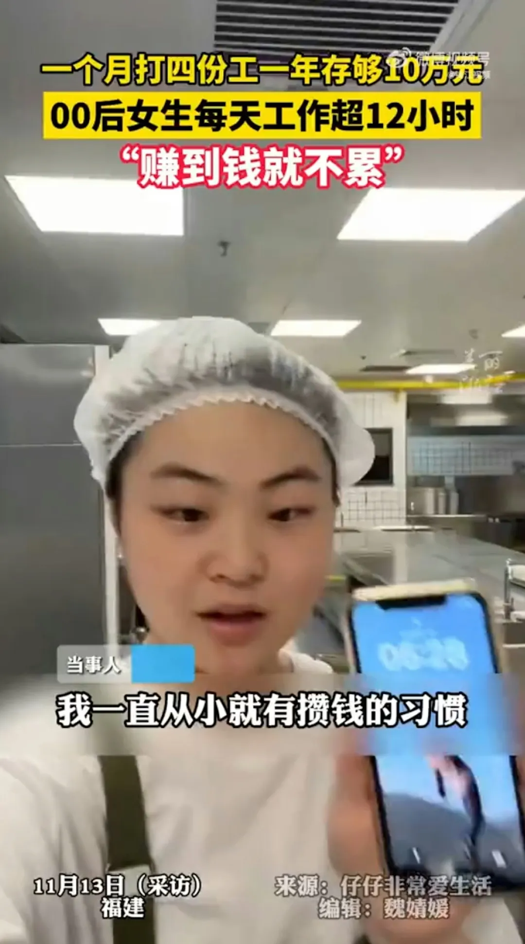 福建一名23岁女生为赚钱狂打4份工,一天只睡不到4小时,一年不到存了10万元(人民币,下同)。