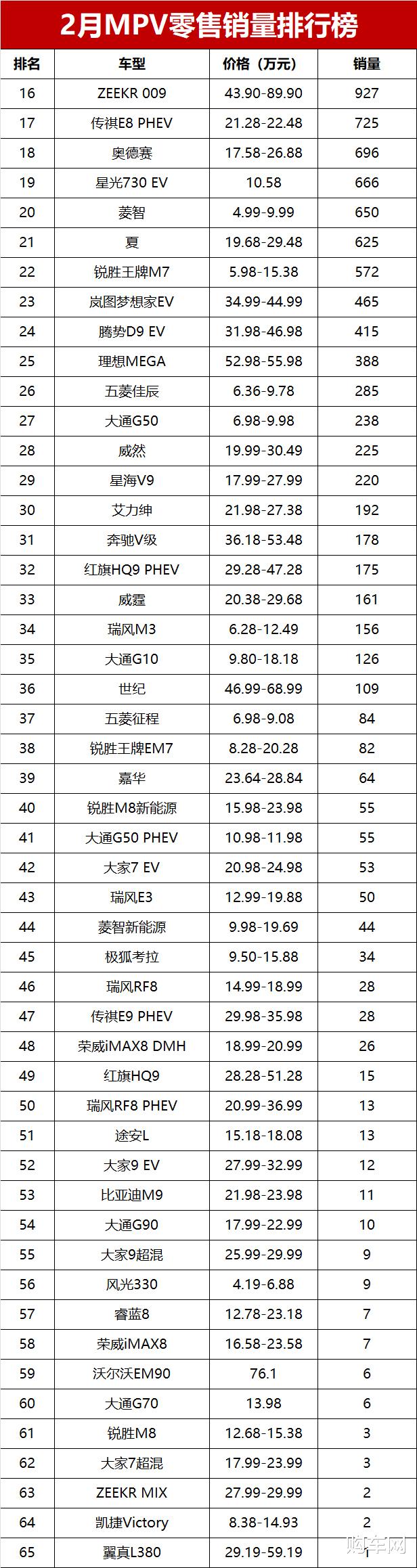 不过也有惊喜,新能源MPV这次表现贼亮眼,好几款都冲进了前十;反观合资MPV,以前的风光劲儿全没了,传统燃油MPV也撑不起场面;而且高低端市场分得特别清楚,平价代步的和中高端豪华的各玩各的,整个2月就15款车销量破千,MPV市场的竞争格局,这下是真变天了!