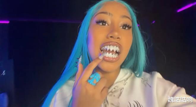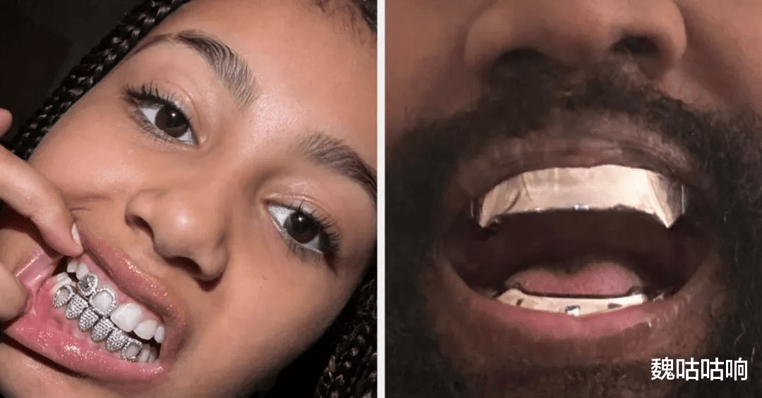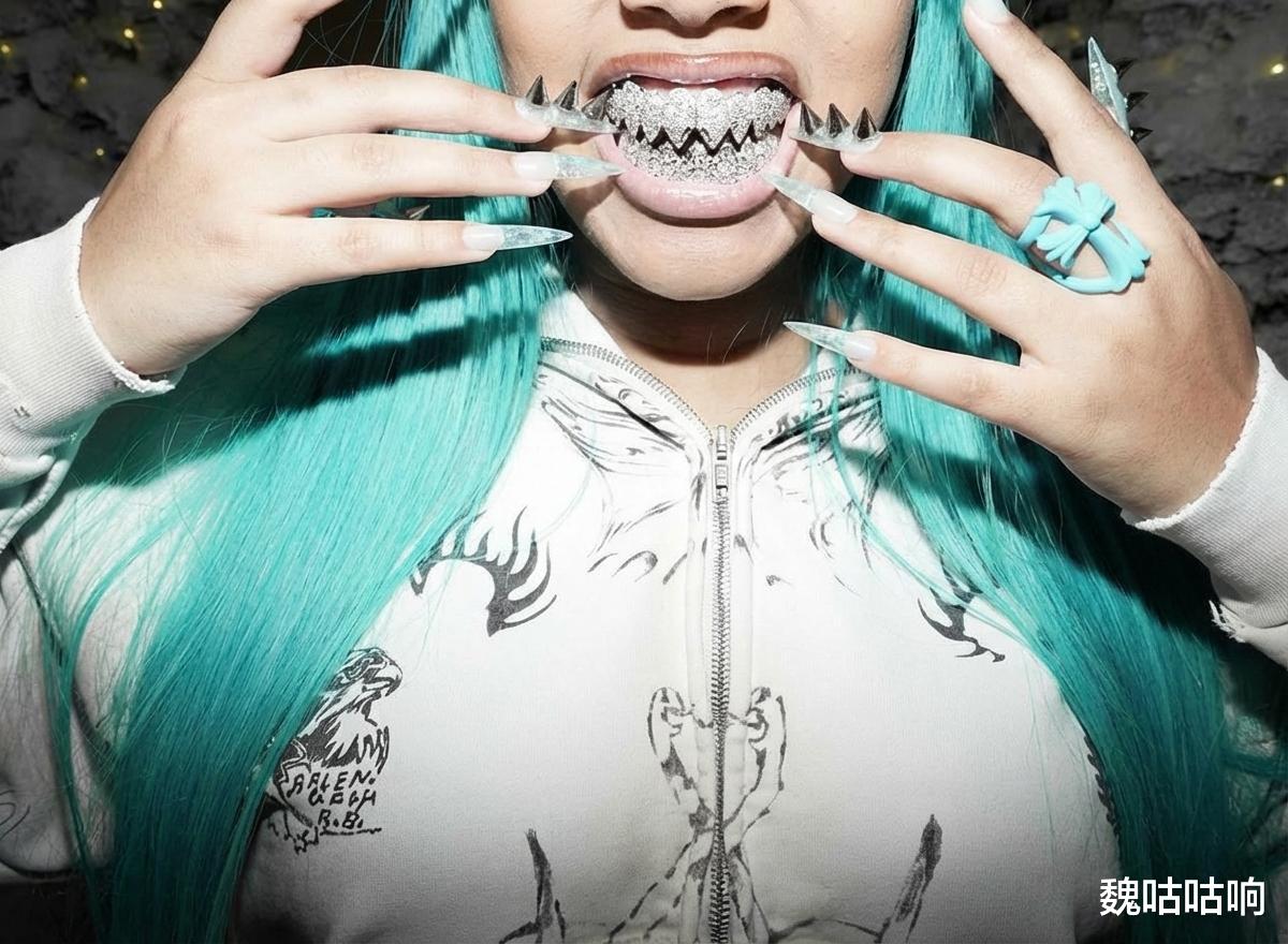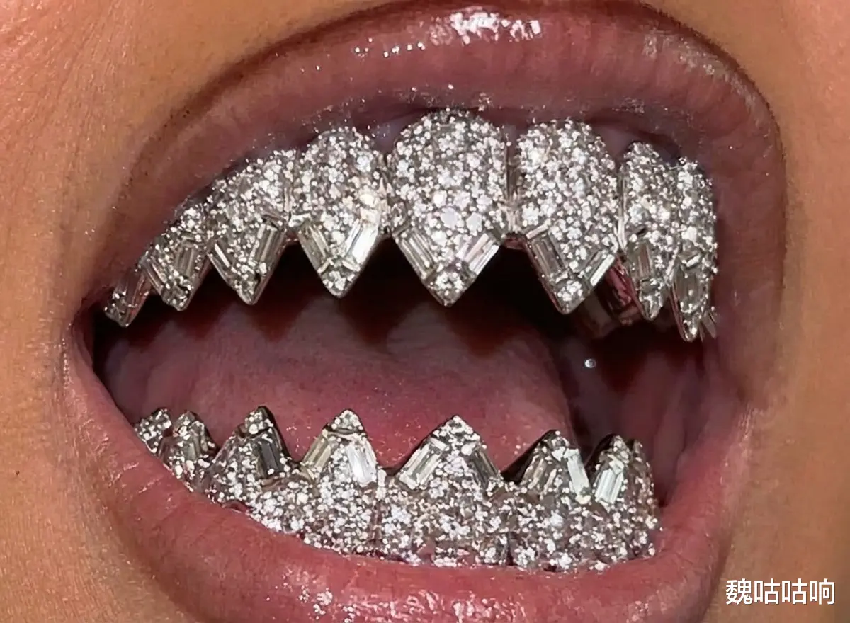 那不是换牙期孩子的青涩笑容,而是一道耀眼冷光:一副覆盖上下牙齿的全钻牙饰(Grillz),被特意打磨成尖锐的“鲨鱼牙”(Shark Teeth)造型。