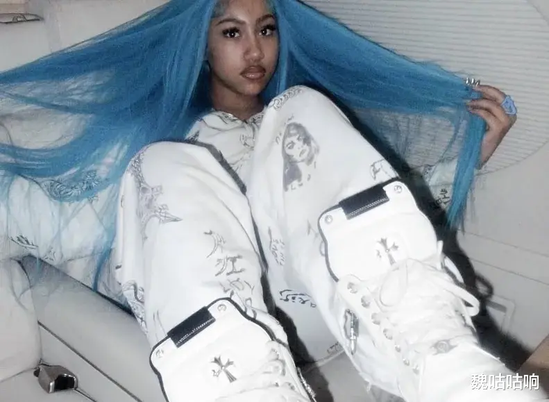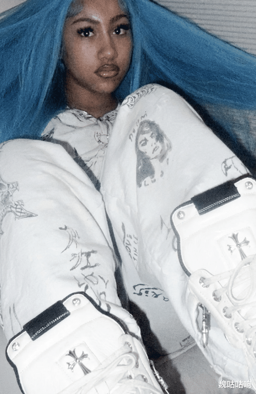North 身着巴黎世家(Balenciaga)印花运动套装,脚踩克罗心(Chrome Hearts)白色高帮鞋;标志性的卷发被拉直,染成了及腰的蓝绿色。更引人注目的是,她摒弃了孩童的素净,化着成熟的全妆,佩戴夸张假睫毛与尖长3D美甲,对着镜头摆出凌厉的表情。