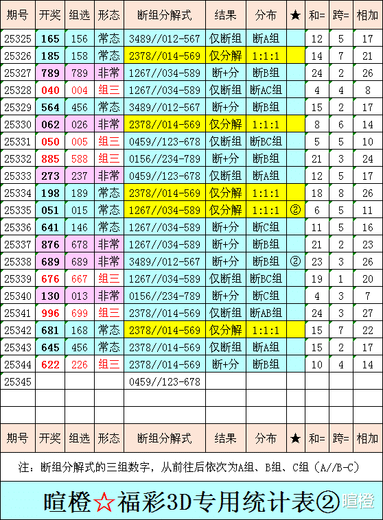 25345期:暄橙福彩3D综合条件(本期将在12月25日21:15开)一、上期回顾 ☆1、上期开奖号:6 2 2。2、和值= 10,跨度= 4。3、组三形态,022路组合。4、热度分布(热:温:冷)1:0:2。二、本期条件 ☆1、三期缺码:0379。2、热:69,温:128,冷:03457。3、断组分解式:0459//123-678。4、四胆:1789;三胆:178。三、术语解释 ☆1、三期缺码:0至9这十个自然数当中,未在近三期开奖号出现的数字。2、热度(热温冷):自然数0至9,在近七期开奖号中,出现3次及3次以上的数字,称为热码;出现2次的数字,称为温码;出现1次和未出现的数字,称为冷码。某个数字在开奖号中出现几个,就按几次计算。3、断组分解式:将0至9这十个自然数,分成三组数字,从前往后依次为A组(4码)、B组(3码)、C组(3码),一般情况下,有一组数字不出码,偶尔会有两组数字不出码。A组不出码的情况相对较少。断组为主,分解为辅。4、常态组六号码:同时包含大数、小数、奇数、偶数、质数、合数的组六号码,共有72注。统计表中,简称“常态”。5、非常态组六号码:全大数、全小数、全奇数、全偶数、全质数、全合数等六种形态的组六号码,共有48注。统计表中,简称“非常”。★提醒:彩市有风险,参与须谨慎!理性购彩,量力而行!多看少买,不要痴迷!任何条件都有出错的时候!水平有限,仅供参考!友好互动,好运相伴!