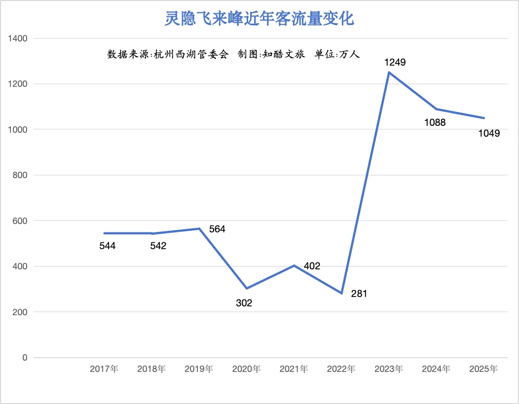 2023年,灵隐寺客流量一飞冲天,全年客流量1249万人次,远超疫情前。2024年、2025年灵隐寺客流量小幅回落,稳定在1100万人次的水平。2024年、2025年灵隐寺客流量的回落,一定程度上是景区太小,客流承载力有限,景区有意控制了客流量的增长。