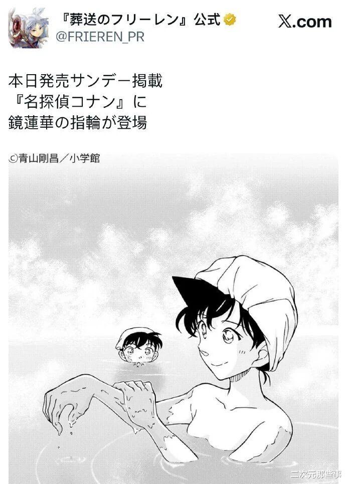 不得不说,这真的是一次梦幻联动,特别是对于喜欢两部作品的人来说真的很惊喜。其实早着2024年的时候这两部作品就有过合作了,毕竟它们都在小学馆的《周刊少年Sunday》连载,当时《葬送的芙莉莲》作者山田钟人与《名侦探柯南》作者青山刚昌合作绘制了一张插画,图中芙莉莲抱着柯南,柯南正在给他戴花环,看起来非常有爱。