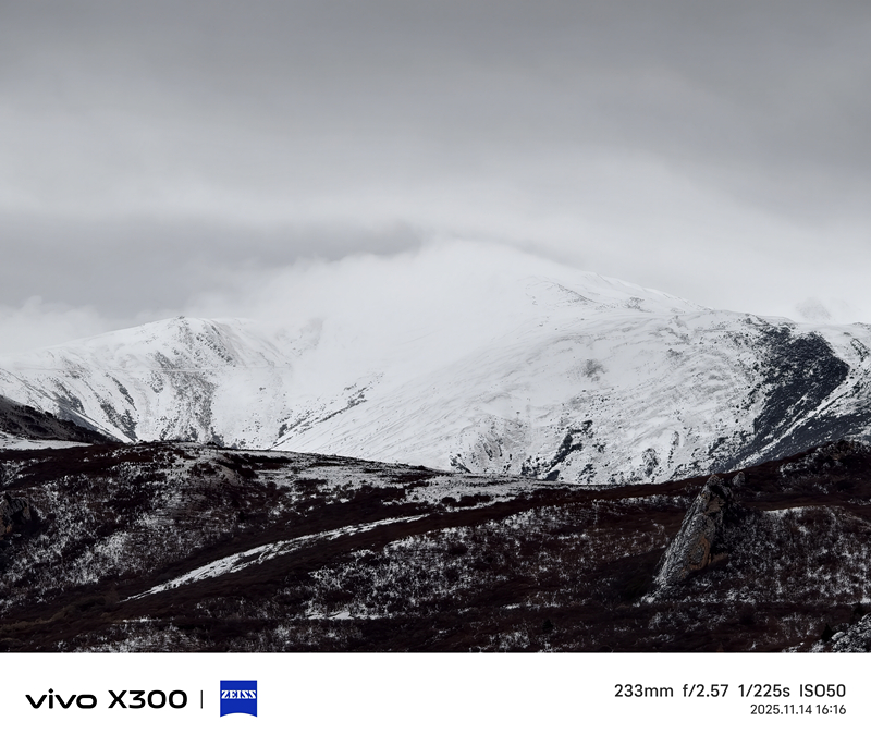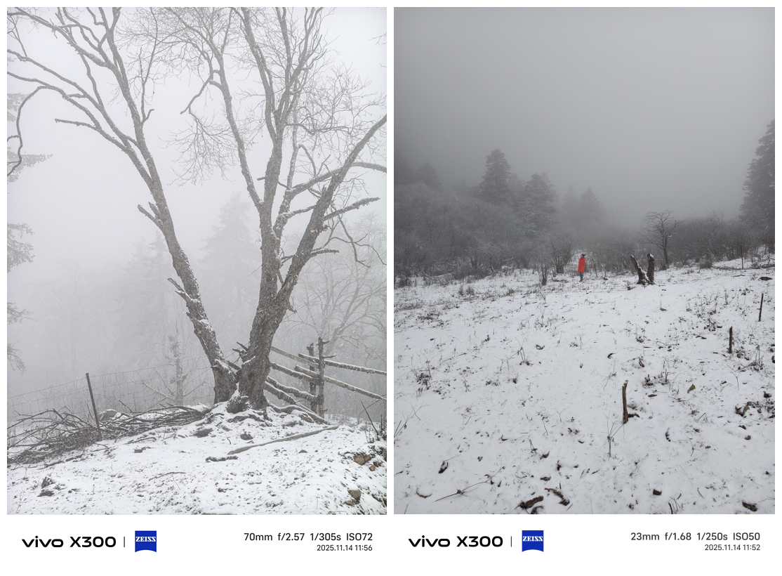 28道拐处的积雪够多,我们这些难得见雪的南方人也趁机可以在雪地里撒会欢了。拍雪景也是检验手机影像是否优秀的一个环节,纯白色的雪不是白芒芒的一片,泥土、石块和枯草交杂在一块,既要拍出各自的细节,又要呈现出积雪的厚度,X300在雪景中的表现不错。唯一遗憾的是,当时我已经冻得手脚冰凉,忘记选择5000万像素,不够该有氛围感还是有的。