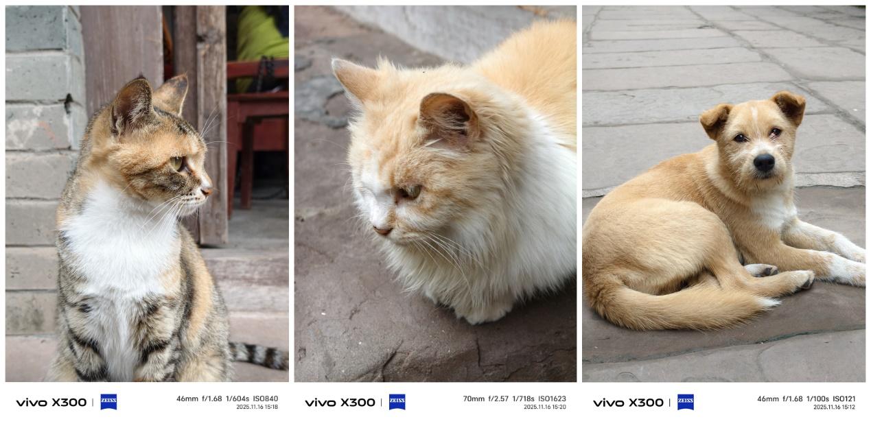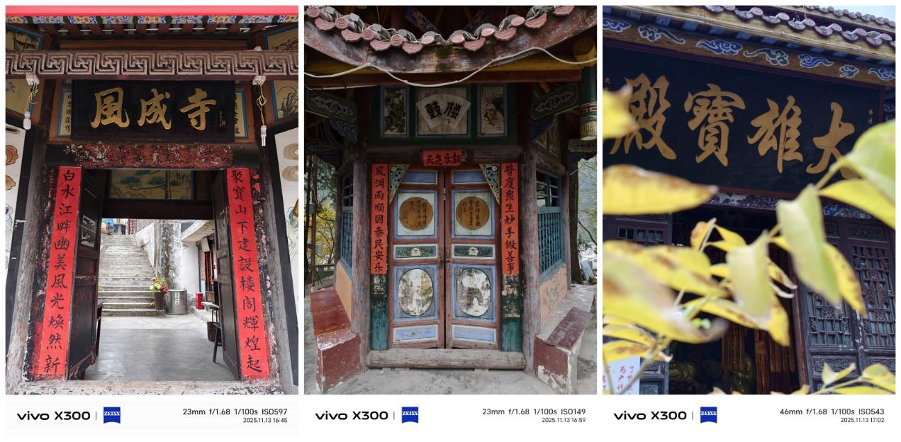 寺庙大门蹲守着一只很有灵性的小猫,小撸一下,它竟然跟着我们往上爬了一截石阶后才钻进旁边的草丛和同伴汇合,似乎在为我们引路。我用vivo X300的抓拍模式捕捉到了几张它的俏皮,不管是转头还是打哈欠的瞬间都能清晰呈现,包括它上窜下跳的动作也能完美定格。X300的抓拍模式很适合拍运动、孩子玩耍和宠物嬉戏的场景,稳定且精准,并且还支持1X(等效焦段23mm)、2X(等效焦段46mm)和3X(等效焦段70mm)的焦距拍摄,适用的场景很多。