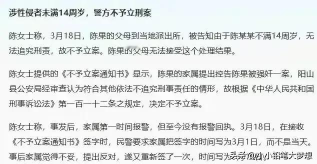 未满14岁男孩强奸8岁女童不予立案的通报来了:合法,合规!我仔细的阅读了通报,男孩对强奸女孩的事实供认不讳,但是因他今年五月份才满14岁,按照法律规定,不负刑事责任,所以不予立案。 目前这个孩子已经送去专业机构进行训诫教育。 相关部门已对受害女孩及其家属进行抚慰。 我看了这个处罚很气愤,真的很无语,我现在在想,明明是祸根,还要留着,这是不是纵容? 我突然想起了之前湖北荆州未满12岁的男孩杀死4岁女孩,那名11岁半的男孩,因为没满12岁所以也不负刑事责任,也是不给予立案,也是送去相关的机构做了心理矫正六个月后,安然无恙的上学了。 女孩父亲说过:“我宁愿我女儿是那个杀人凶手,她受到了未成年人的保护,还得到了义务教育的权利……~” 可惜她女儿就是白死了,她女儿也是未成年人,请问她的权益又在哪呢? 等同于此案,女儿受到了强奸,她也是未成年人,对方明明犯了法,证据确凿,对方也承认了,还是没办法治他的罪,这是多么的无奈和悲催! 有一些孩子,他一出生就是阴暗的,犯罪负刑事责任不应该以年龄来划分标准。 现在的孩子过早接触网络和手机,已经比较早熟了,而近几年来青少年犯罪就越来越低龄化,会越来越极端。 未成年法是保护未成年人,而不是保护未成成年犯罪分子,无论年龄,只要你犯罪了,就应该受到相应的惩处,如果再这样纵容下去,会引起更多人去模仿,社会带来更恶劣的影响,修改刑法已经到了迫不及待的地步了!