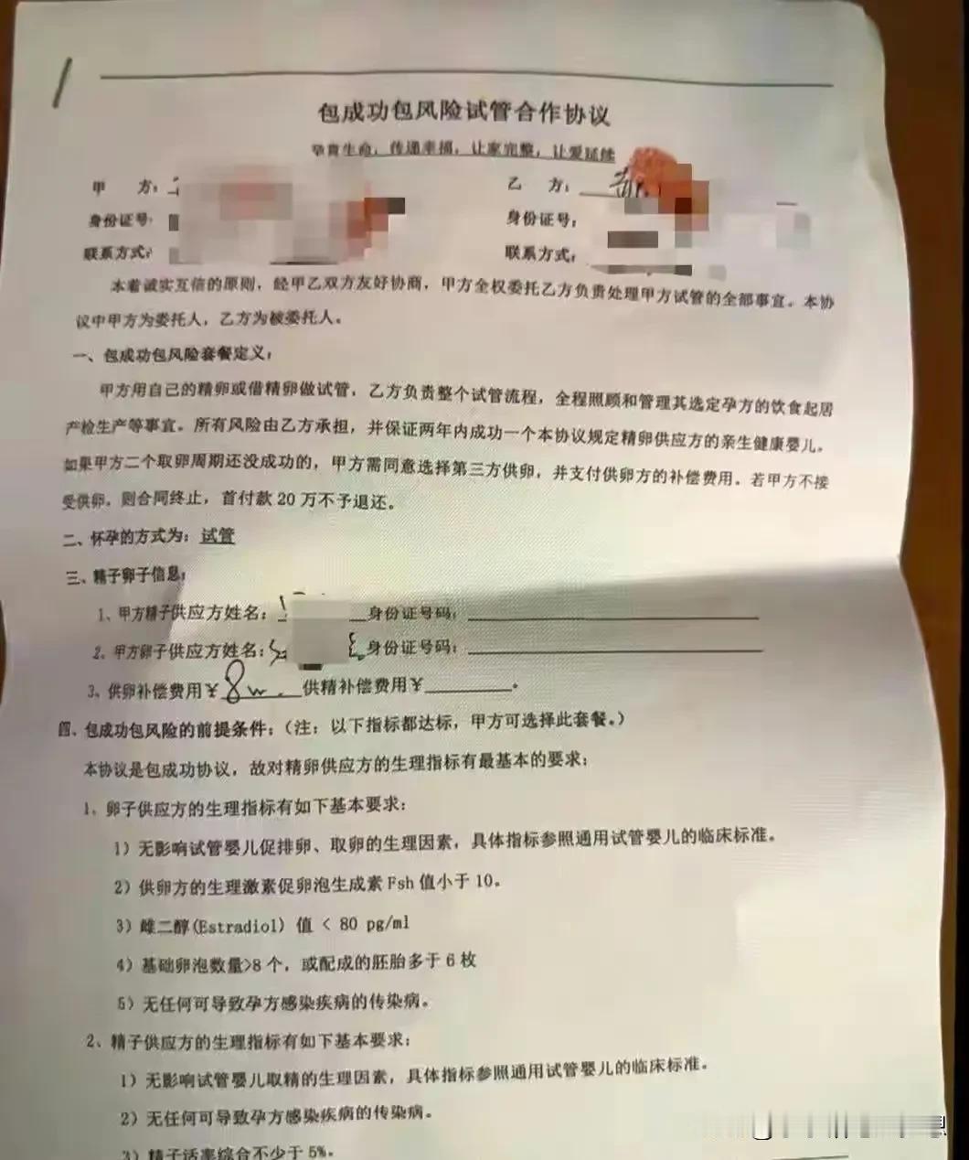 一女子爆料称丈夫瞒着自己找人非法代孕,用试管婴儿的方式已经生下了一儿一女,协议签订包成功一个婴儿65万,另外还有额外的条款和奖励! 妻子称自己跟老公结婚多年,两人共育一个女儿,已经8岁了。 2022年1月他就发现老公有一份代孕协议,当时她老公坦诚的告诉她说是2021年12月份去签的这份协议,她当时就反对了,劝老公不要去这么做这是违法的,老公也同意不去做。 结果2023年的6月份,她从老公的生意合作伙伴口中得知,自己的老公已经在代孕机构生下的一个男孩,孩子已经挺大了,第二胎的女儿也准备出生了。 后来她就打听这个男孩的出生时间,了解到是2022年的11月份,也就是说她老公根本没听劝,后面还是去做了,而且还顺便冷冻了胚胎。2024年的1月份他的女儿出生了,在同一家机构出生的,也就是说女儿是用之前冷冻的胚胎,而提供卵子的女人只有19岁。 2023年的8月,也就是她知道老公有两个孩子后的两个月,她的手机上就收到了陌生人发来的4张照片和短信,短信的内容是叫她老公把儿子接回去照顾。 四张照片,其中的两张是她老公与男孩合照,她老公和供卵女子的合照。 而他签订的协议的内容如下: 首付要交15万。 胎儿着床三个月后,每隔两个月要支付尾款,直到婴儿健康交付。 供卵女子得到8万。 如果是双胞胎,要额外支付15万。 如果是剖腹产,要额外支付2万/个。 婴儿的各种支出,月嫂费用,亲子鉴定,胚胎冷冻等等都得自理。 要弄出生证明要另外交2万。 如果出生的婴儿超过七斤二两,每重一两会奖励500块钱。 女子爆料之后,市场监督管理部门已经介入调查了。 记者也打电话给她老公询问情况,一开始她老公说没有代孕,当记者说不是有两个孩子了吗?对方就直接挂断电话了,记者不死心又拨打了电话,对方接了之后就说这是我的私事,关你们什么事,我为什么要跟你讲。 爆料的女子称自己将这个事情爆出来,已经做好最坏的准备,她要到法院起诉离婚。 看了一下这笔经济账,娶老婆自己生比在外面生孩子要划算多了,男的为什么在外面生了呢?他们已经共同育有一个女儿了,男子生育肯定没问题,因为他后面用试管婴儿方式生了两个。那排除原因就是女的不愿意生?或者是怀不上?男的肯定很喜欢孩子,想要生儿子。 在我国,代孕是明确禁止的,这是违反公序良俗的事情,是属于违法的,要追究刑事责任的,但是好像罚的并不是太重,看了之前的案例,也就大概罚个3万到5万之间。 现在很多地方非婚生子女已经能合法上户了,这确实也是法律的一种漏洞,代孕非法,但非婚生子女合法,确实有点搞笑。 #记录我的2024# #我来唠家常#