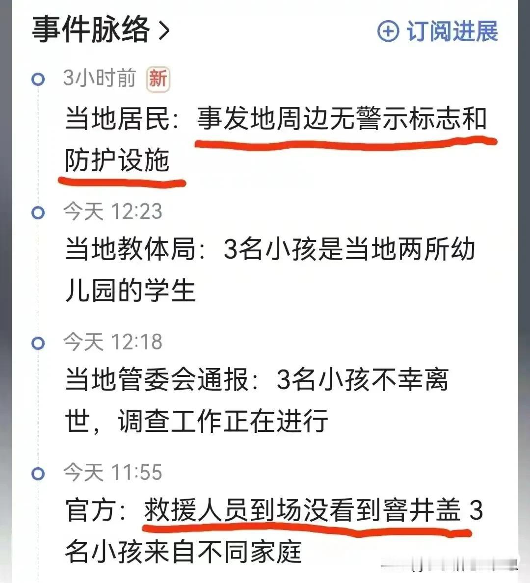 离大谱了!化粪池居然没有井盖,这到底属于哪方在管?三名小孩就掉进了这个化粪池不幸身亡。据目击者称掉进去是四个,有一个被一个老爷爷拉上来了,但是老爷爷的孙子却死了。 三名孩子都是幼儿,都在上幼儿园,当天晚上没想到在草坪上追逐就掉进化粪池里了。 救援人员用了3个小时才将化粪池抽干,三个孩子被救了上来,但最终三名孩子还是不幸死亡。 孩子悲痛欲绝的质问:“为什么没有井盖?而且周边没有任何的指示牌,这属于哪个部门在管?我们的孩子就这么没了!” 现在家长们都在殡仪馆守着孩子,他们希望相关部门能够给他们一个说法! 发生的这样的悲剧,真的痛心,这确实是管理不善造成的悲剧,听说现在还在争论到底是哪方要负责? 造成这类惨案的主要原因如下: 1、小孩都是在3~4岁之间,很多家长在看孩子的时候,喜欢围着聊天,玩手机,而孩子贪玩,喜欢追逐,喜欢好奇的东西,在这件事情中,家长对孩子安全疏于管理,应该受到谴责; 2、化粪池是公共基础环卫设施,有明确的管理部门,有专业的维护队伍,在绿化草坪公共活动区域,设置化粪池本身存在严重安全隐患,这件事情中,化粪池不但没有井盖,而且也没有危险标语提示,相关部门应该负全部责任,包括刑事责任。 3、因为是相熟的几个孩子在玩,又是家里家附近的小区公共区域,所以家长潜意识的认为在这里玩孩子是安全的,这是错误的想法,真的是难过,悲痛,希望这件事情大家能够吸取教训,避免悲剧再次发生。
