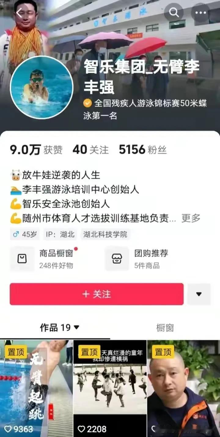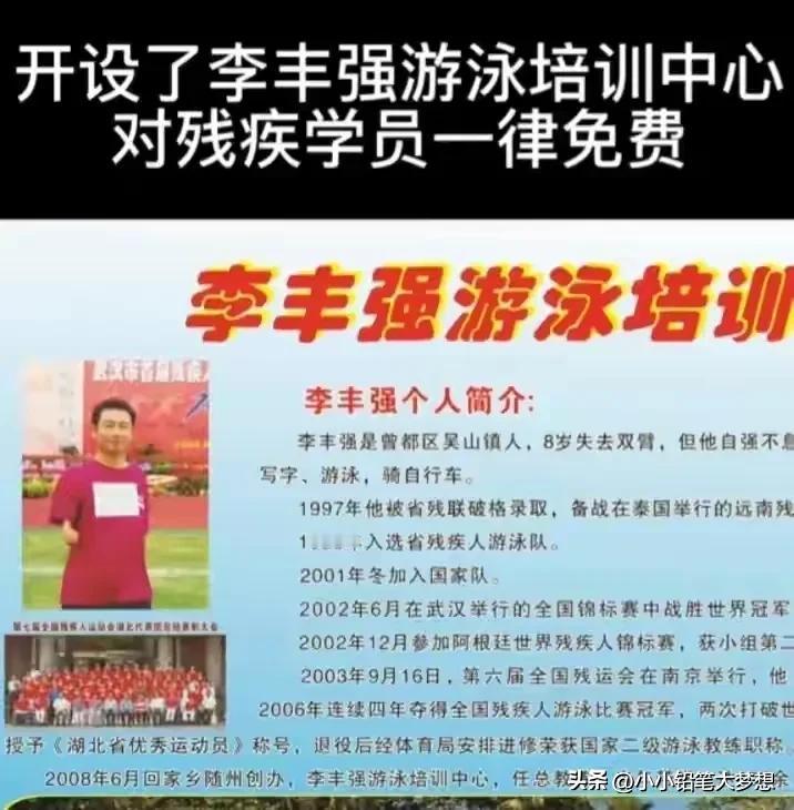 地铁无臂大哥的身份曝光,简直惊呆我了,无臂大哥坐地铁走无障碍通道,被地铁工作人员拒绝要求出示残疾证后续,大哥出来回应,“人员只是按制度办事,不希望他工作受到影响,只要能帮到残疾人群体自己感到很高兴。” 我特意去看了这个大哥的某音,发现他真是个人物啊,他的经历简直惊呆了我! 他叫李丰强,是一个农村娃,八岁那一年,帮家里放牛,高压电线掉了下来砸中了他,当他从医院醒来之后,发现自己一只手臂全部截除,另外一只手臂截了一半,经历了巨大的打击之后,他调整了心态,因为他看到了妈妈这段时间为了他白了头发,他为了不让妈妈为他操心,所以他学会了坚强,他开始慢慢练习用双脚自理。 他整个童年都遭受了各种各样人投给他的异样的目光,所以他五年级就辍学了,一边在家放着牛,一边用收音机听着外面世界的精彩,他慢慢学会了乐观向上,他面对命运,对他的不公,他没有妥协,他学会了坚强,他勇敢的挑战自己,慢慢的他学会了穿衣、做饭、写字、骑自行车…… 但是命运并没有因为他的不幸眷顾他,某一年的一个夏天,他在河边玩耍,突发其来的洪水,把他卷走了,水流非常的湍急,他差一点就被淹死了,他努力的挣扎,在绝望中,他居然发现自己学会了游泳。 他的游泳技术越来越好了,97年香港回归那一年,他为了庆祝,自己骑着车到了汉口的江滩横渡了长江。 他甚至经过了自己的努力,通过了国家残疾游泳队的层层考验,顺利成为残疾游泳队的运动员! 经过了三年拼搏努力,他一共赢得了56名奖牌。但是后来因为高强度的训练,他的腰受伤了,最后被迫退役了。 退役之后,他为了生存,他选择自主创业,他干过很多脏活累活,每天起早贪黑的,卖过保暖内衣,开过拖把厂,他为了照顾残疾人,甚至开厂招来的员工全都是残疾人。 但是都由于缺乏经验,收益甚小,最后选择了放弃,回到了自己的家乡后,他干起了自己熟悉的游泳行业,他创办的飞鱼俱乐部,自己当起了教练,他还帮助了很多残疾人免费教他们学游泳。 2014年,他创立了湖北智乐游泳设备有限公司,2018年,他还成立了残疾人的服务中心,培训中心,2021年他创立了湖北智多电子有限公司。 他公司71%的员工都是残疾人。现在公司发展很好,他的客户已经遍及全球了! 他很自豪的对外面的人说:“别看我们的身体残疾,但是我们做出来的东西并不残缺!” 看着他的故事,真的觉得很励志,一路走过来,充满坎坷,跌跌碰碰,起起伏伏,真的不容易,正如他所说:“即使身陷泥泞中,也要拼尽全力爬出来,走出属于自己的路!” 他很勇敢,很坚强,很乐观,很善良,他就是那个被雨淋过,还要为别人撑伞的人!实在是佩服,为他点赞! #春日生活打卡季#