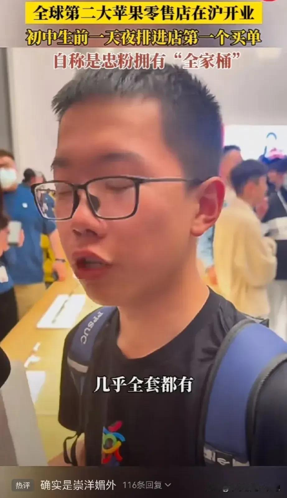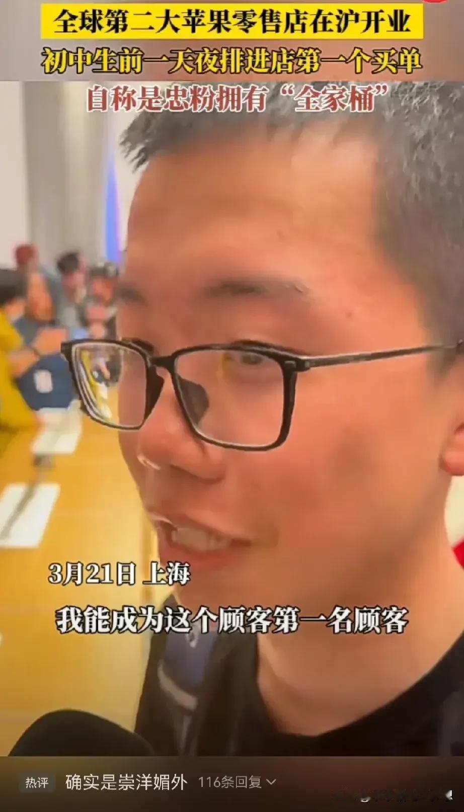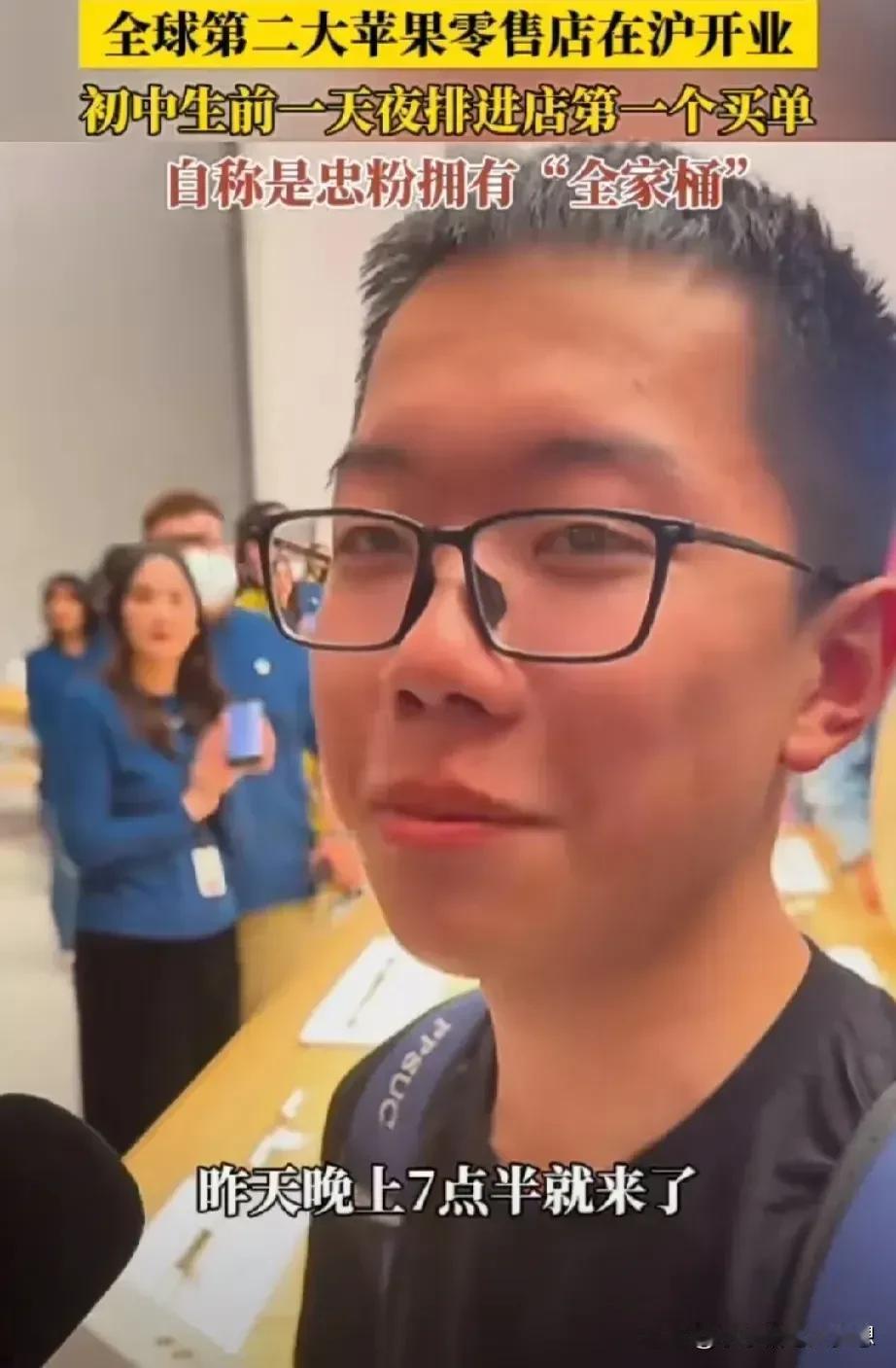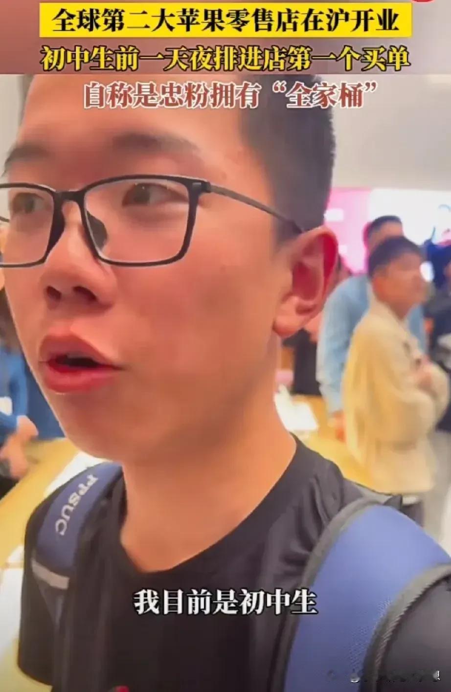 广州这一个孩子火了!他是上海苹果静安店首笔交易的顾客!他说在售卖前一个晚上七点半钟就已经在等候,他说自己是个初中生,是苹果的老忠实粉丝,苹果全套的电子产品,他几乎全凑齐了! 他说自己是第十个进店的客人,但是是第一个买单的,所以说他就是冲进去,一秒钟就交钱的那个!不得不说,真的是疯狂! 疯狂的不只是他,还有很多从外地赶过去的,但这些大多数都是已经成年的年轻人。 苹果上海静安店,库克亲自开门迎客,生意火爆,人山人海,所以开门仅1小时宣布营业结束 ,很多人为此感觉气愤,毕竟从大老远过去,有钱也竟然没买到! 不过最让我觉得不可思议的还是这个初中生,先不说他的经济实力吧,可能家庭殷实,但是这也太疯狂了吧,千里迢迢,又不是星期六,星期天,居然逃课,不顾学业跑到上海就为了一个外国品牌的手机,这疯狂着迷的程度让我惊讶,前一个晚上七点多钟,等到第二天,不知道学习有没这个毅力! 这种崇洋媚外的现象,其实我觉得挺可悲的,更恐怖的是,家长也支持,这种教育是可悲还是可叹呢?他的疯狂这让我想起了当初那个卖肾买iPhone的。 如果你是孩子的家长,你会也支持孩子这种做法吗? #我来唠家常#