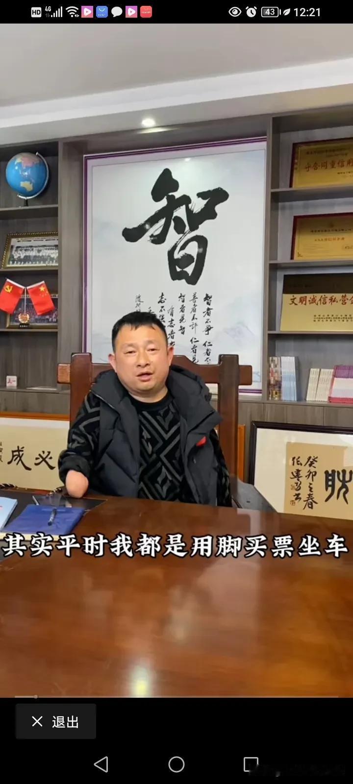 无臂男子坐地铁被要求出示残疾证事件后续,地铁道歉后无臂男子刚刚发长视频回应了,因为很多人去骂无臂男子:“既然认为证没用,为啥要去办证,既然办理了证为啥不带,既然人家已经愿意协助你,为啥要发网络……” 男子说,其实我平常都是用脚买票坐车,坐飞机,坐地铁的。 这次是刚好路过武汉要坐车去重庆,国家从去年9月份已实行了无障碍通行,所以想试一下无障碍通行,所以就发生了视频中的工作人员要求出示残疾证来证明自己是残疾人才能免费乘车的频。男子认为自己的残疾已经很明显了,而且像自己这种情况,没有双手的情况下,自己也很难去掏出证件,他觉得这个规则有点太不人性化。 这件事情在网络上引起了很大的轰动,地铁道歉之后,很多人就说他故意找工作人员的麻烦,还有人说他为了火,有人还说他装B,他说他知道工作人员是按规定办事的,他能理解,他很感谢工作人员的爱心,想要为他买票,但是他说他自己有能力付这个钱,他这一次是想代表残疾人发声,他作为一个残疾人的创业者,自己出门就很不方便,他公司70%的员工都是残疾人,所以他清楚的知道残疾人的不容易,他只是觉得这个规定可不可以更人性化?更合理一点。 本来残疾人自卑心就强,每走出去一次都不容易,他希望更多没有走出家门的残疾人能够勇敢的融入社会里面去发光发热,去实现自己的梦想,同时,他也希望大家不要去追究武汉地铁的事情,如果广大的残疾人有需要帮助的都可以联系他,他一直在路上! 其实我觉得这件事情他没有错,工作人员也没有错,错就错在制定这个制度的人太死板,刻板,太教条,而下面的人为了保饭碗就不敢违规,现在他的发声最起码引起了地铁方对残障人士权益方面的一些照顾,我觉得是好事儿。 还有有些人说他装B,想火的人可能不了解他,他是一个很优秀很能干的人,虽然一路走来坎坎坷坷,他却在逆境中重生,你看了他的人生经历,你就觉得他是一个了不起的人物! #我来唠家常# #春日生活打卡季#