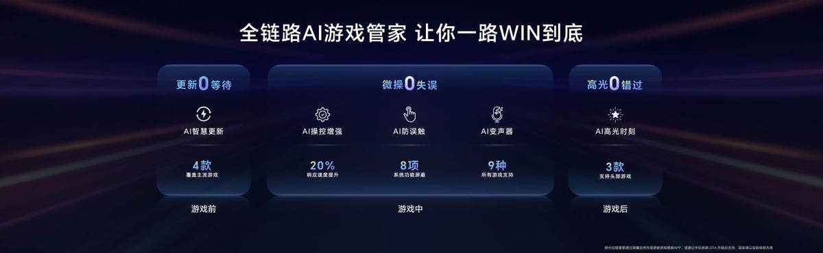 荣耀WIN系列拥有全链路AI游戏管家,带来“AI智慧更新”“AI操控增强”“AI防误触”“AI变声器”“AI高光时刻”等功能,更新0等待、微操0失误、高光0错过,全面提升玩家的电竞体验,一路“WIN”到底。