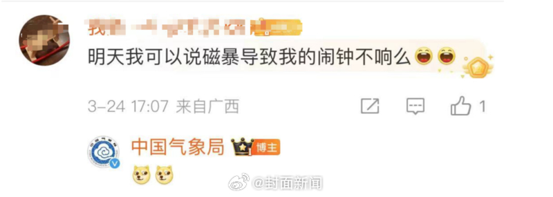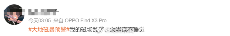 【#大地磁暴上热搜评论区亮了#】#我的磁场终究还是乱了#据中国气象局消息,3月24日、25日和26日三天,将可能出现地磁活动。其中3月25日可能发生中等以上地磁暴甚至大地磁暴。当大地磁暴预警上热搜,评论区亮了,网友表示:我的磁场终究还是乱了,也有网友表示可以说是磁暴导致闹钟不响么。#大地磁暴#(中国青年报)