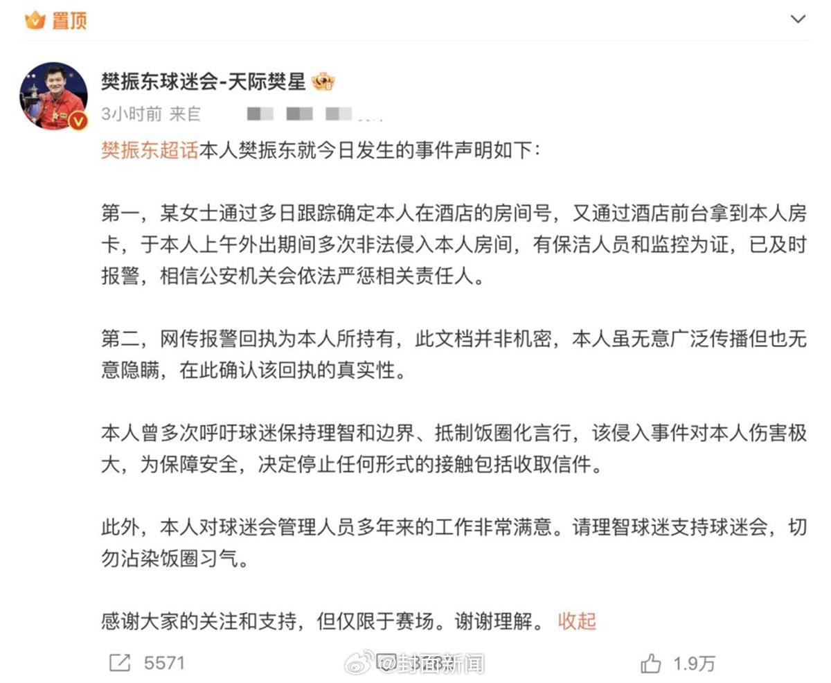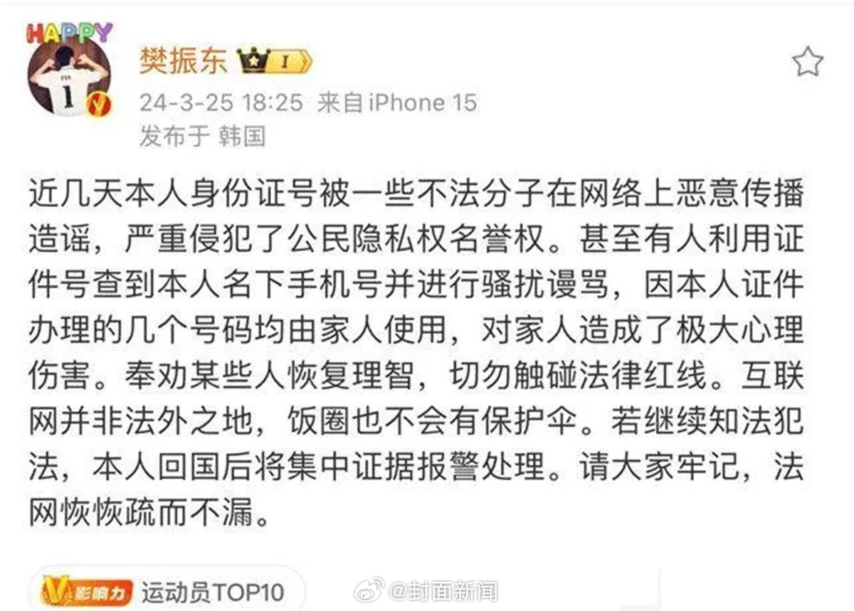 【媒体评:#樊振东希望球迷远离饭圈陋习#】#樊振东称饭圈不该有保护伞#3月25日,乒乓球运动员发文维权,引发关注。樊振东曾多次发文呼吁抵制“饭圈”不良风气,希望球迷远离饭圈陋习。樊振东说得很对,“饭圈”不会有也不应该有保护伞,饭圈失序、饭圈外溢等现象带来的种种问题,如果涉及违法违规的,就应该用法律来规范处理,让侵犯他人隐私、扰乱社会秩序、实施网络暴力等突破法律底线的行为,受到应有的惩罚,付出沉重的代价。(极目新闻)