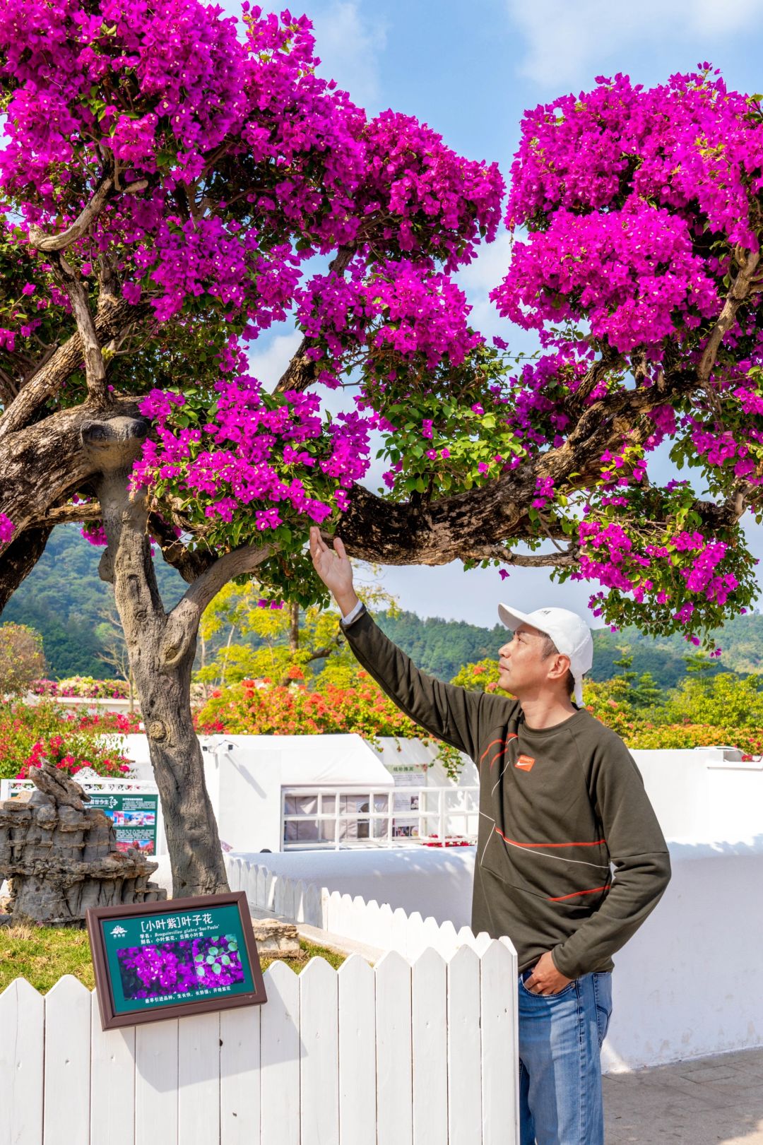 青秀山有仿希腊的蓝白主调建筑,搭配艳丽的叶子花,映衬蓝天碧海,美轮美奂。搭配了秋干等元素,叶子花也成为南宁独具地中海风情园林景观中,非常适合打卡拍照喔。
