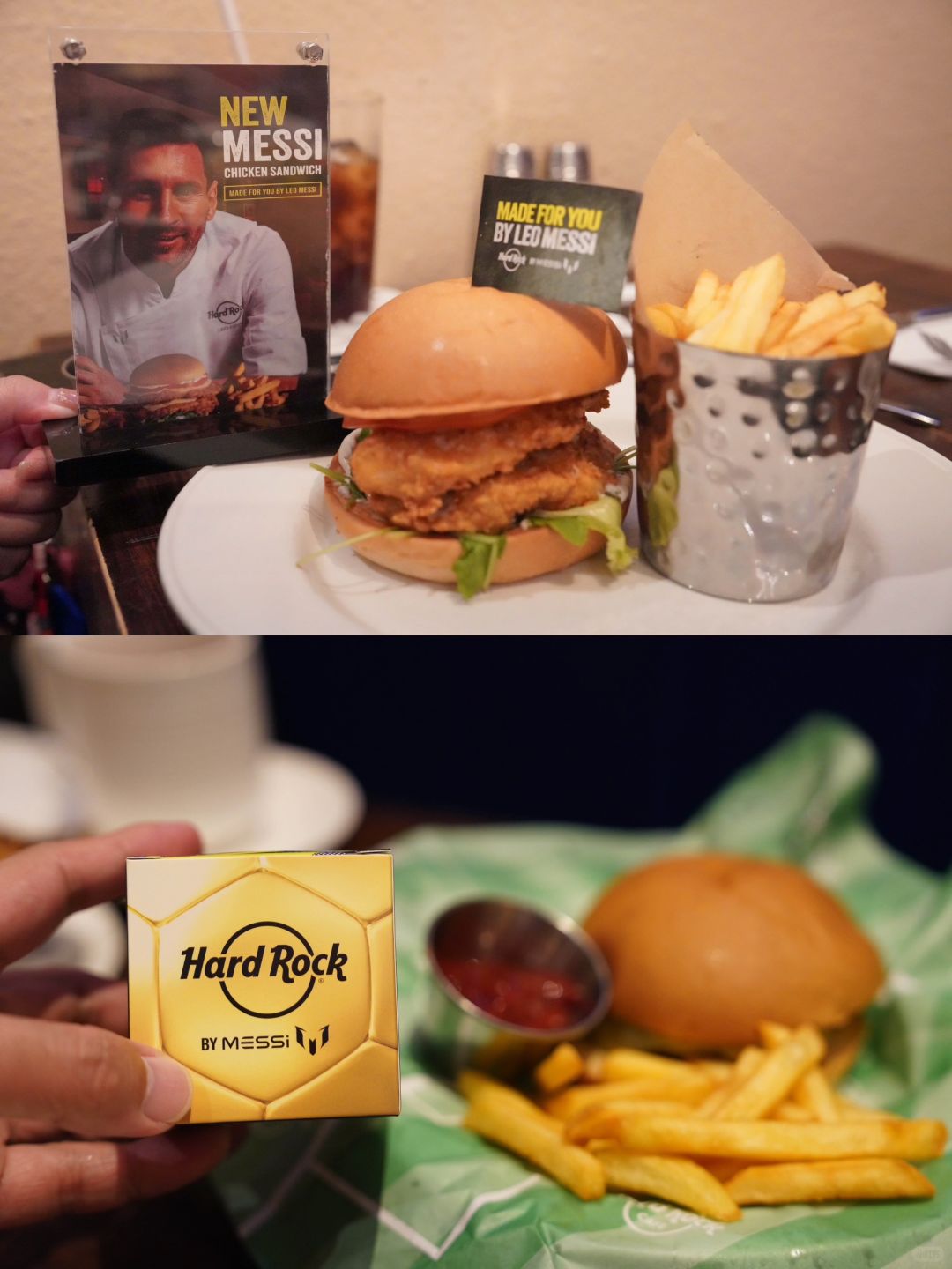 🌭强烈推荐梅西鸡肉三明治,这是硬石酒店和莱昂内尔·梅西 (Lionel Messi) 合作推出的“Made For You by Leo Messi”鸡肉三明治;酥脆的米兰风格鸡胸肉,上面铺有融化的波伏洛干酪和香草蒜泥蛋黄酱,搭配新鲜的西红柿和芝麻菜,放在烤面包上。带小孩一定要试试最近新出的🍔梅西汉堡包,连垫纸都印了足球场的图案,小孩还有硬石梅西联名小金球送哟。