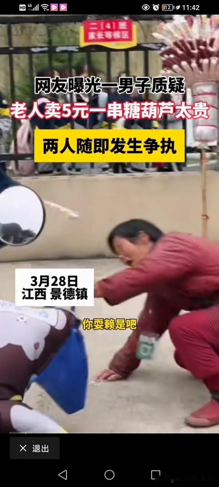 这个男人火了,他当街对着一个老奶奶大声吼:“你想耍赖是吧?你想骗小孩的钱啊?你这玩意卖五块钱,你想在派出所过夜,是吗?” 3月28号,江西景德镇,一个小学旁,一位老奶奶和一个中年男子吵了起来,老奶奶趴在地上,中年男子对着他大声怒吼“你想耍赖是吧?你想骗小孩的钱啊?你这玩意卖五块钱,你想在派出所过夜,是吗?” 原来,老奶奶每天都在这里卖冰糖葫芦,想要挣点生活费,老奶奶会卖两种冰糖葫芦,一种就是卡通型的棉花糖的,一种就是山楂裹糖的,都是按串卖一串五块钱。 这名中年男子嫌这个老奶奶卖给他家小孩的5块钱冰糖葫芦卖的太贵了,所以一直在怒骂她,旁边路过的一位女士实在看不过眼了,就拍下了这样一个视频,发到网上并说明情况:“她说她的舍友每天都会买这个冰糖葫芦,五块钱,他觉得并不贵,而且老奶奶下雨天也在这里卖,挺辛苦的。” 其实我挺不明白这个男的为什么这么说,现在的物价这么高,一根冰糖葫芦卖五块钱,其实是良心价,而且明码标价的东西,五块钱一串,你买得起就买,买不起就不买,而且小孩也知道价格,这不算讹诈,你这样秋后算账算什么? 而且还当街大骂老人这就太不应该了吧,如果你实在觉得贵了,那你就跟老人商量一下,看能不能退,这也是一种办法。非得在大街里面这么辱骂老人吗?你自己没有父母啊,老人自食其力挣点钱不容易的。 这男就是欺负老实人,有本事去骂火车上25块钱一盒贵,候机大厅60块钱一碗面贵…… #我来唠家常# #记录我的2024#