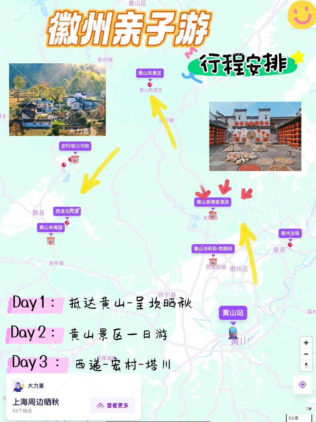 出行交通: 上海虹桥-黄山北站,🚄高铁单程约2.5h;黄山北站-徽州县,🚗车行单程约0.5h;